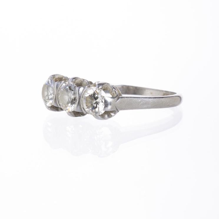 Anillo tricillo en oro 18 K blanco con tres diamantes talla brillante (el central de 0,35 ct aprox. y los laterales de 0,30 ct aprox. cada uno). Diámetro interno 17 mm. Peso bruto 3 gr.