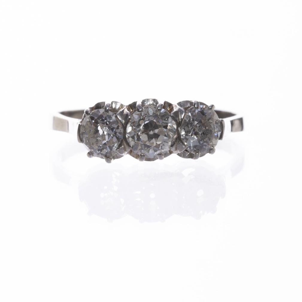Anillo tricillo en oro 18 K blanco con tres diamantes talla brillante (el central de 0,60 ct aprox., y los laterales de 0,50 ct aprox. cada uno). Diámetro interno 19,5 mm. Peso bruto 3 gr.