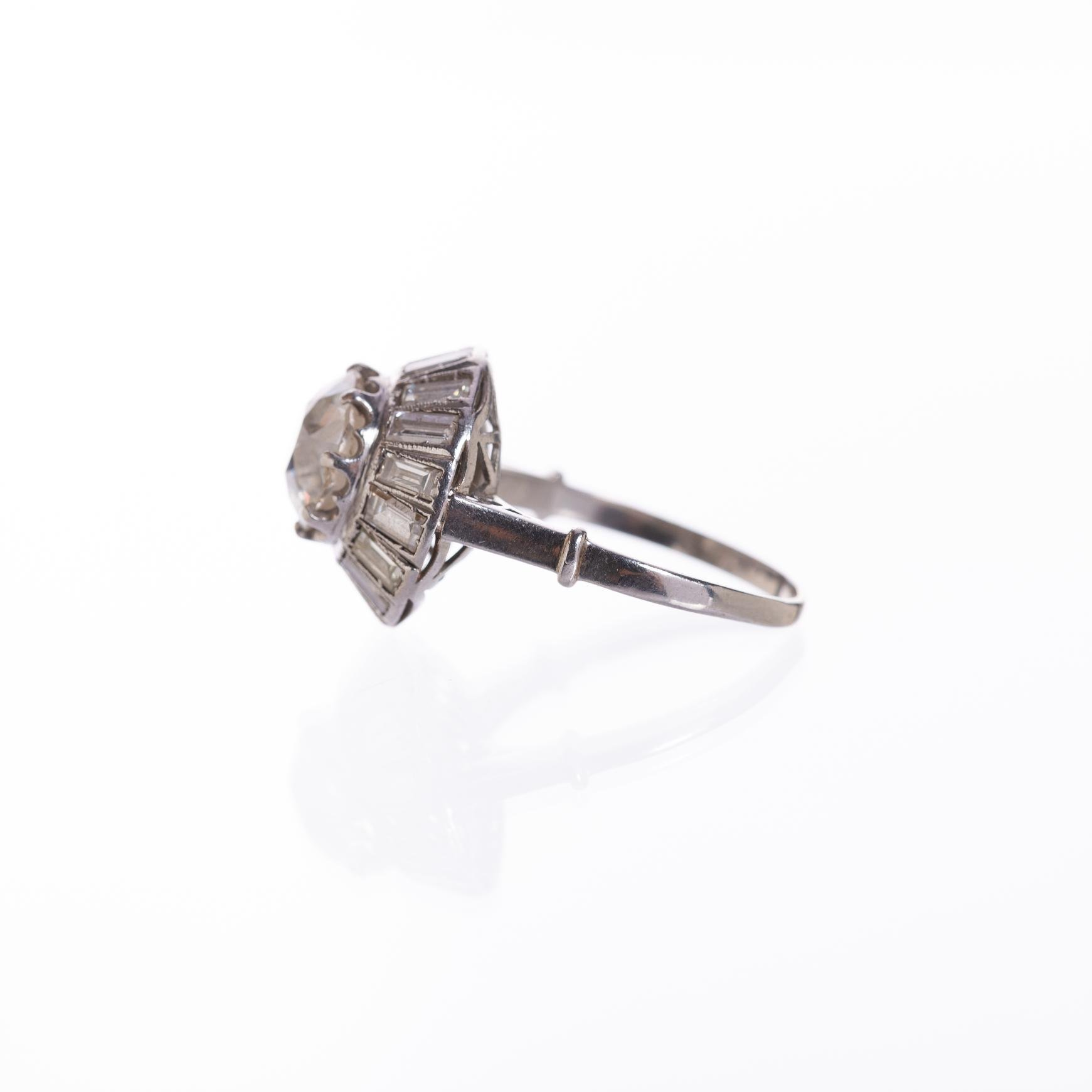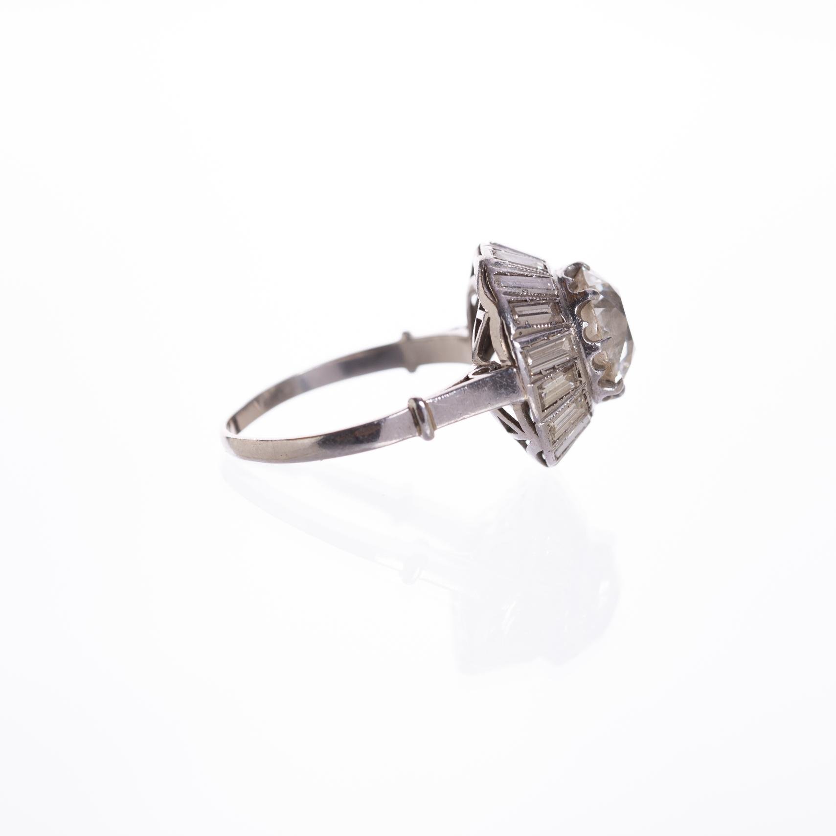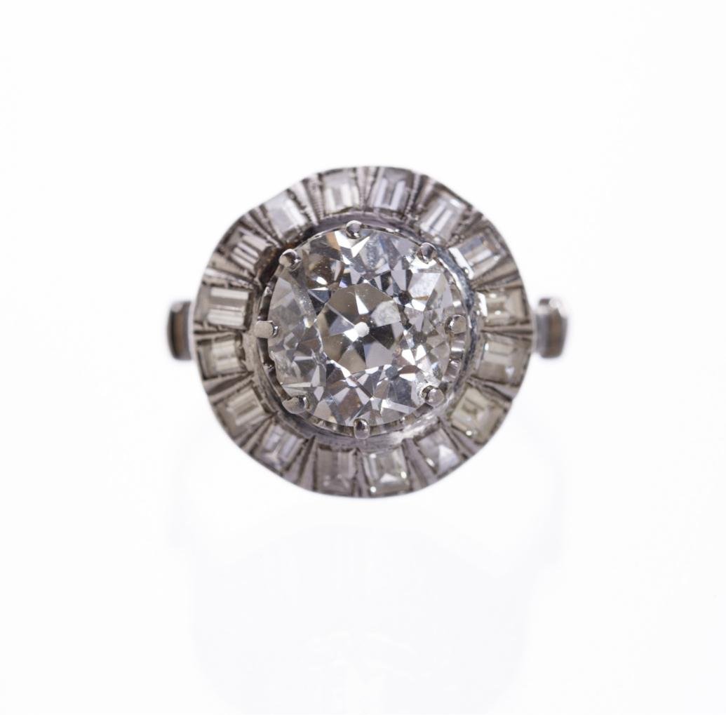 Anillo en oro 18 K blanco con diamante central talla brillante de 2,80 ct aprox. (9,2 x 6,2 mm) rodeado por dieciséis diamantes talla baguette de 0,10 ct aprox. cada uno. Diámetro interno 18 mm. Peso bruto 6,8 gr.