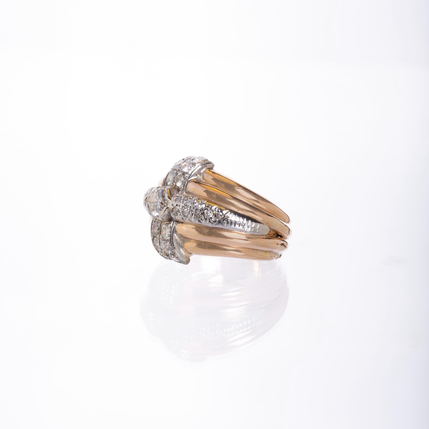 Anillo años 40 en oro 18 K amarillo y blanco con brillante central de 0,50 ct aprox y treinta pequeños diamantes laterales talla brillante. Diámetro interno mm. Peso bruto 16,8 gr.