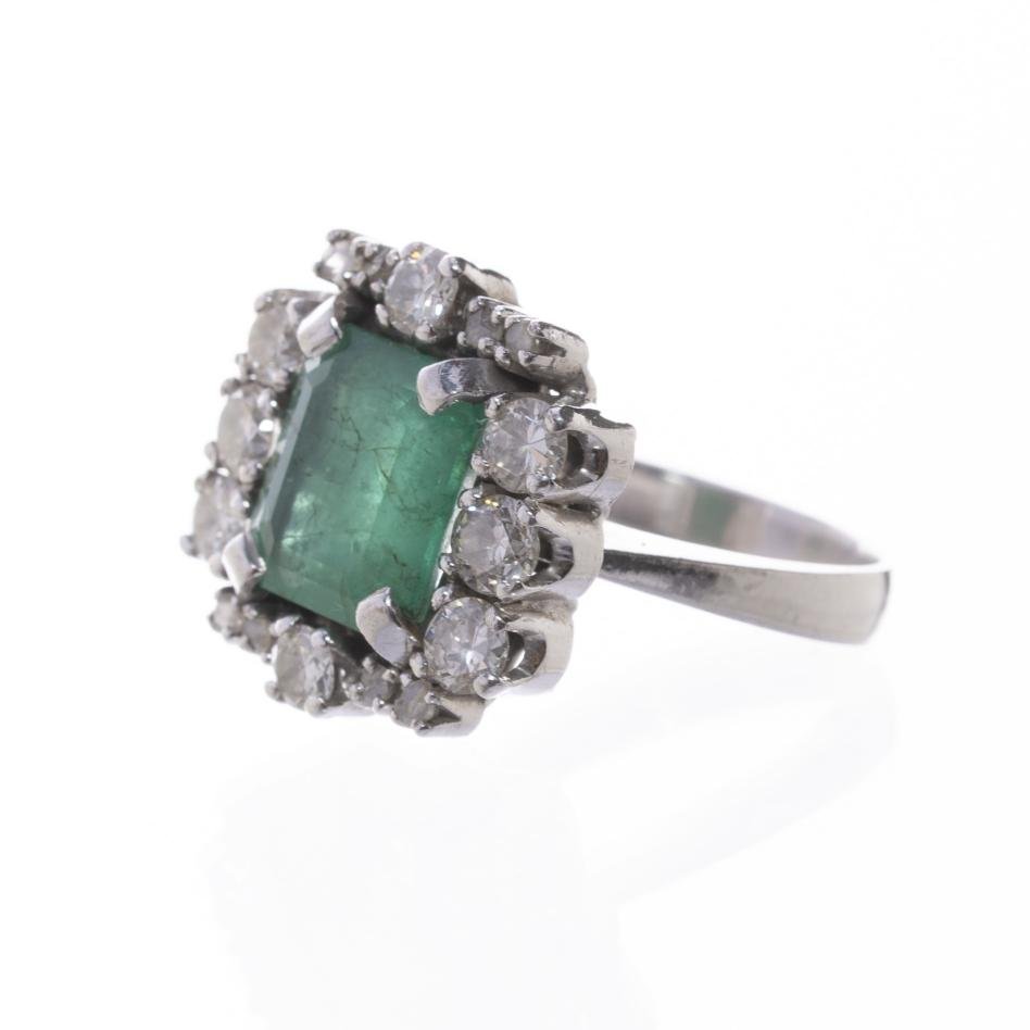 Anillo en oro 18 K blanco con esmeralda central talla rectangular de 9,2 x 8,3 x 5 mm rodeada por ocho diamantes talla brillante de 0,12 ct aprox. cada uno y ocho diamantes. Diámetro interno 16 mm. Peso bruto 7 gr.