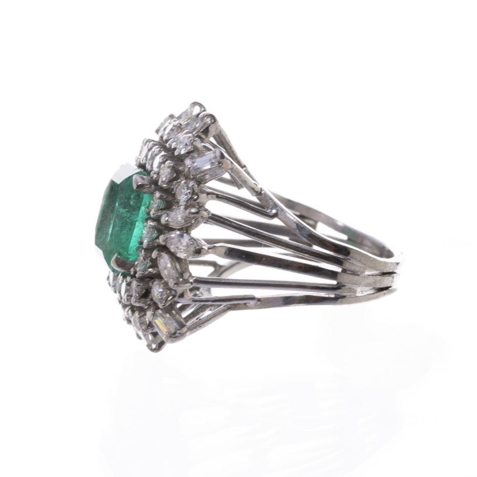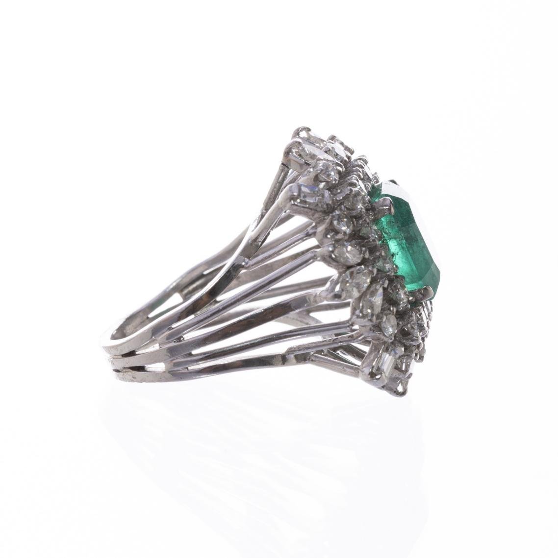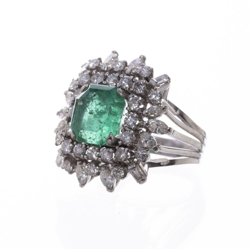 Anillo en oro 18 K blanco esculturado en forma de flor con esmeralda central de 10,2 x 9,1 x 6,9 mm, veintiséis diamantes talla brillante, diez diamantes talla navette y cuatro diamantes talla baguette. Diámetro interno 17 mm. Peso bruto 13,7 gr.