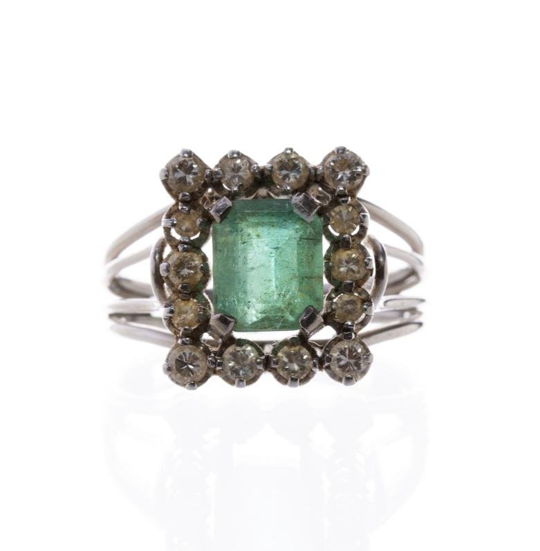 Anillo en oro 18 K blanco con esmeralda central talla rectangular de 7,9 x 6,6 x 5,2 mm rodeada por catorce pequeños diamantes talla brillante. Diámetro interno 18 mm. Peso bruto 6 gr.