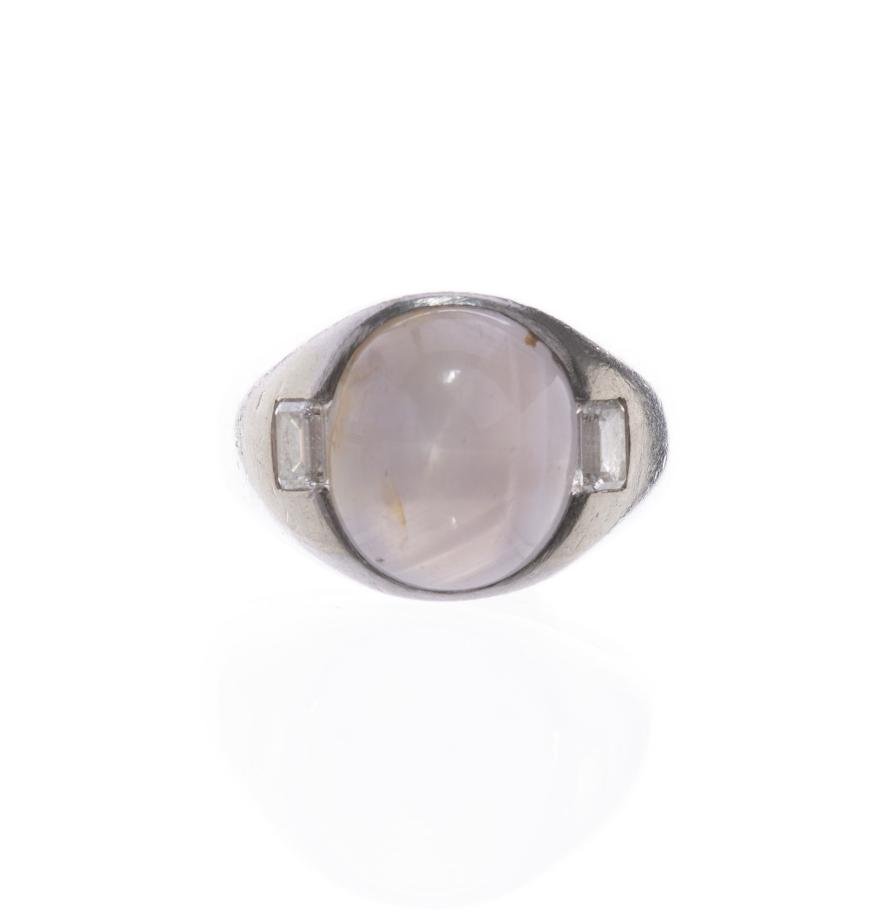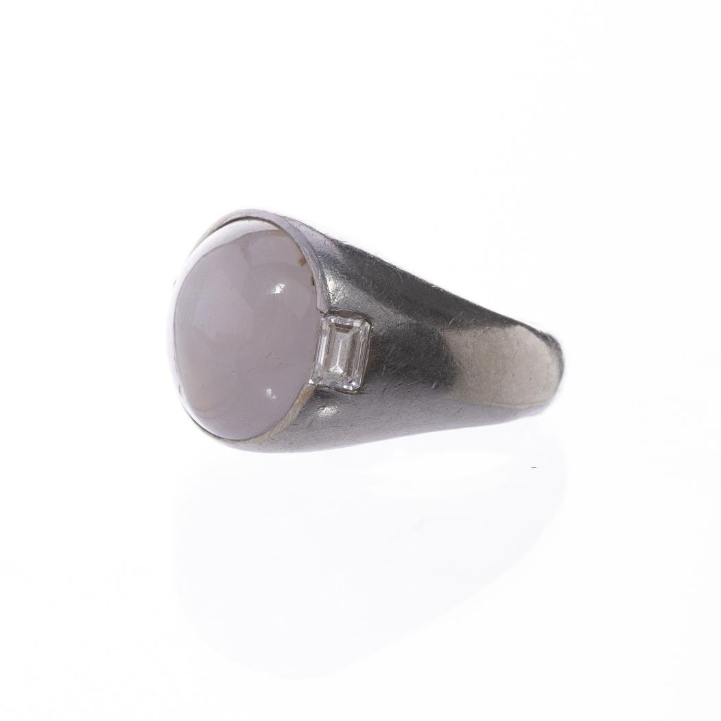 Anillo en oro 18 K blanco con ópalo central talla cabujón y dos diamantes laterales talla baguette. Diámetro interno 17,5 mm. Peso bruto 17 gr.