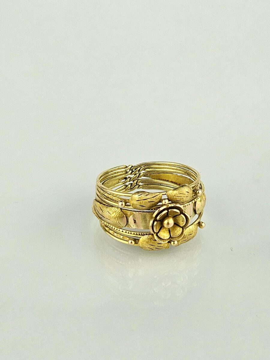 Anillo en oro 18 K amarillo decorado «flor», realizado con siete anillos entrelazados. Diámetro interno 17 mm. Peso bruto 3 gr.
