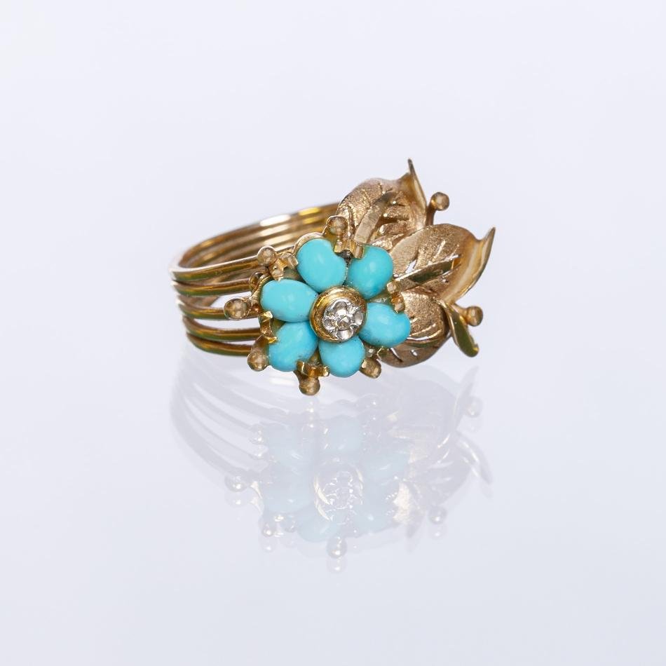 Anillo en oro 18 K amarillo esculturado en forma de flor, con pequeño brillante central y cinco turquesas talla cabullón. Diámetro interno 17 mm. Peso bruto 6 gr.