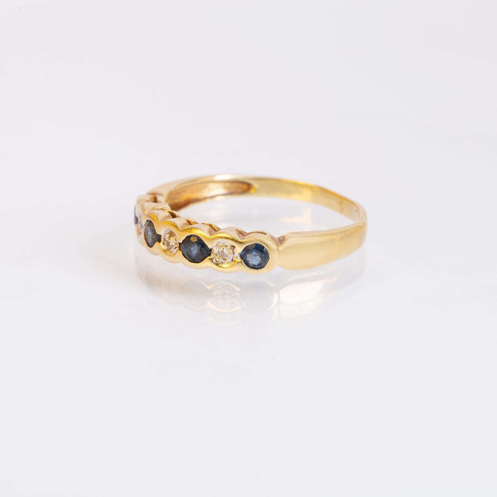 Anillo medio sin fin en oro 18 K amarillo con tres pequeños diamantes talla brillante y cuatro zafiros. Diámetro interno 17 mm. Peso bruto 2 gr.