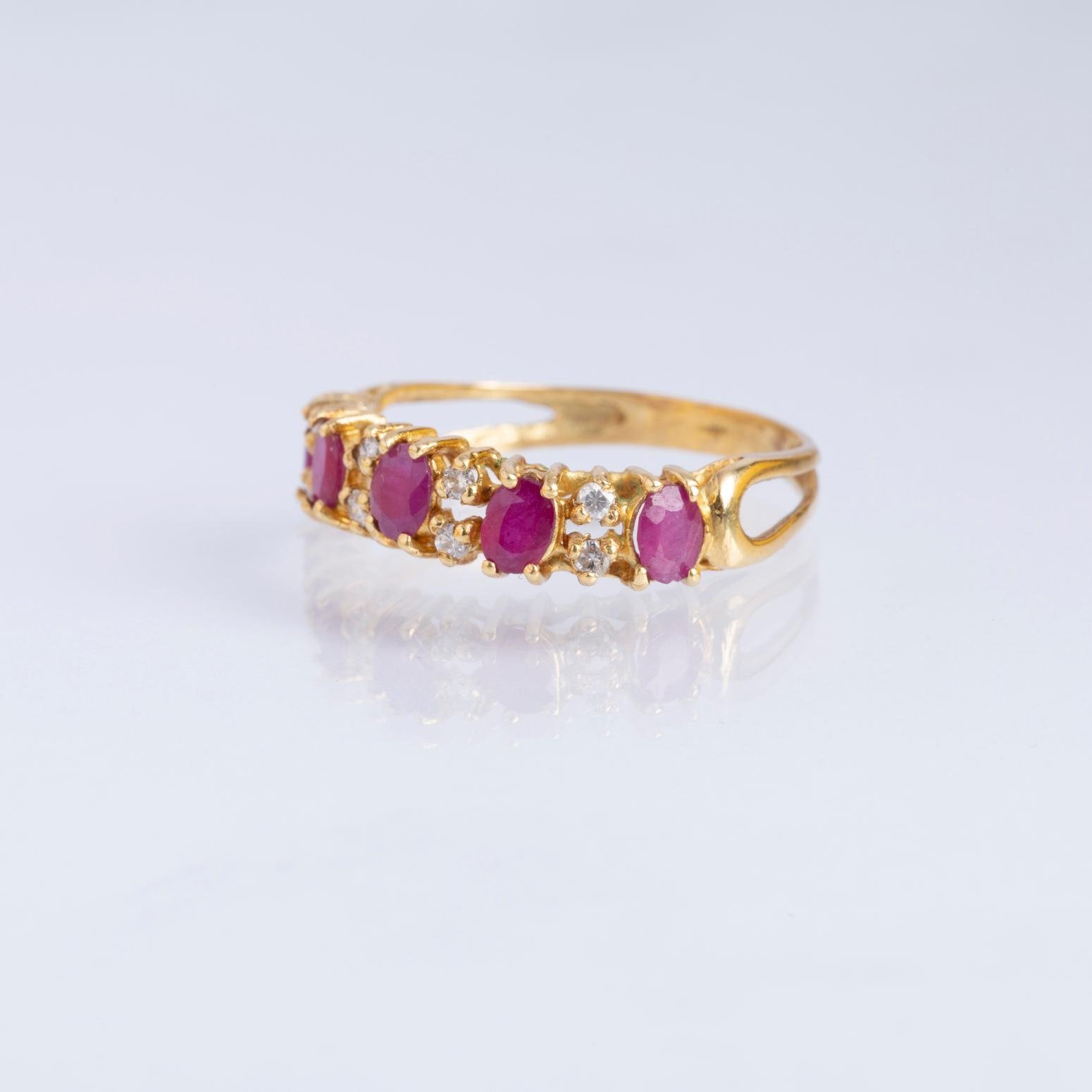 Anillo en oro 18 K amarillo con cinco rubíes talla oval y ocho pequeños diamantes talla brillante. Diámetro interno 18 mm. Peso bruto 2,3 gr.
