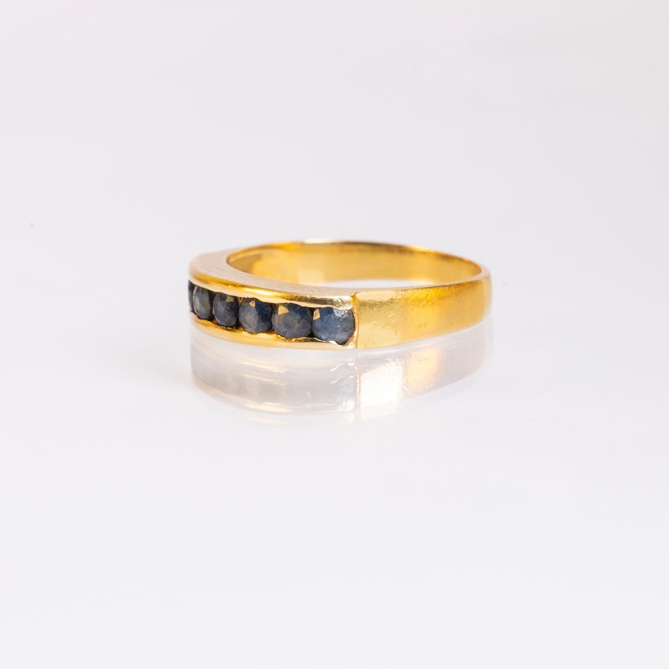 Anillo medio sin fin en oro 18 K amarillo decorado con siete zafiros talla redonda. Diámetro interno 17 mm. Peso bruto 3 gr.