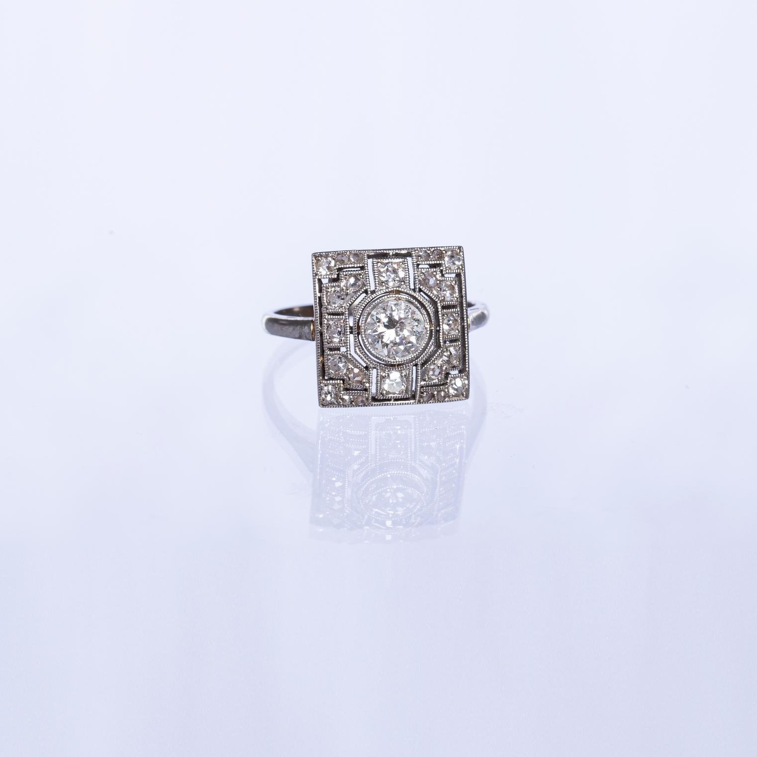 Anillo art decó en oro 18 K blanco con brillante central de 0,50 ct aprox. Mesa cuadrada de 13 x 13 mm decorada con varios pequeños brillantes y diamantes. Diámetro interno 17 mm. Peso bruto 3,5 gr.
