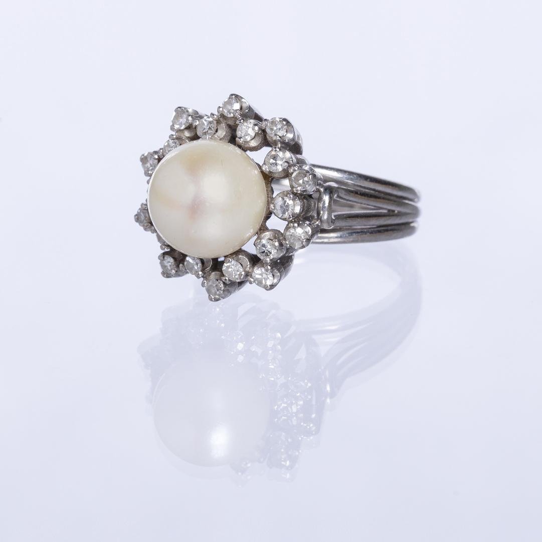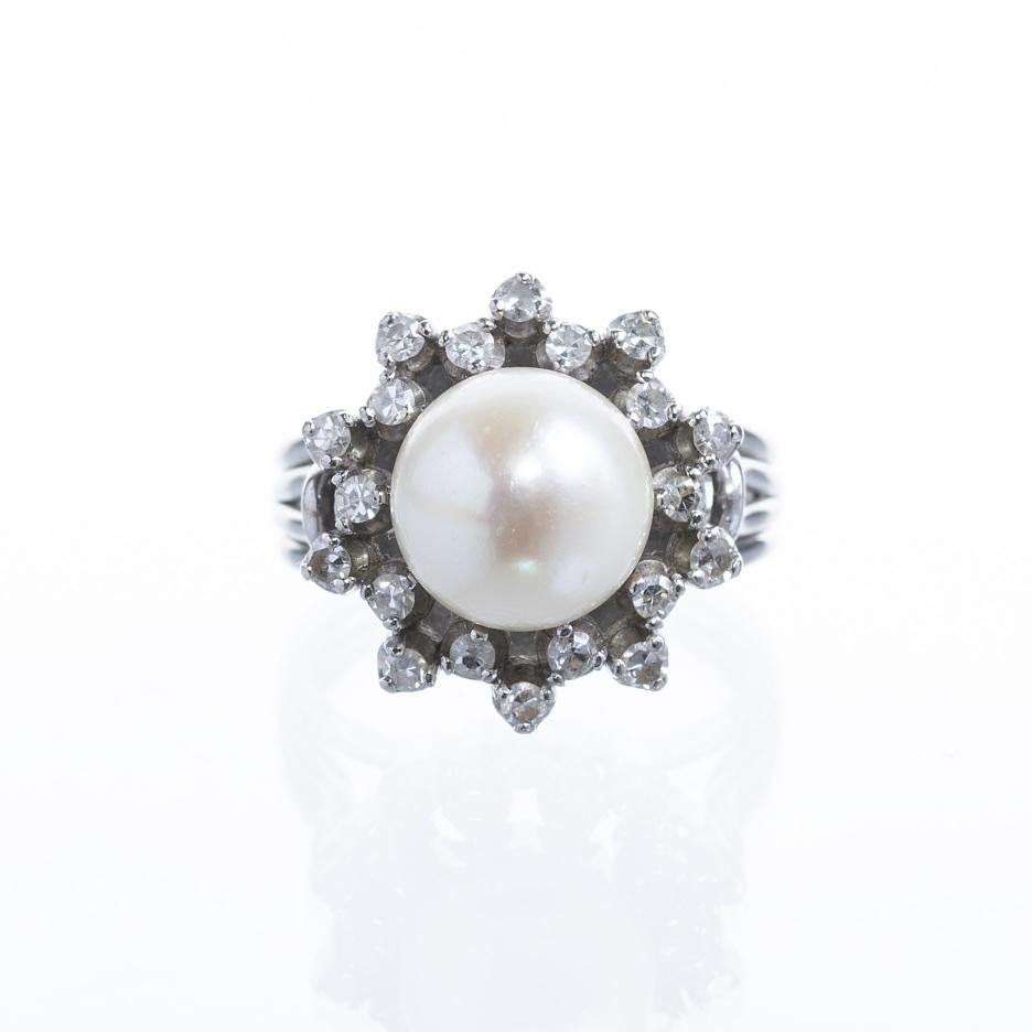 Anillo en oro 18 K blanco en forma de flor, con perla central de cultivo de un diámetro de 9 mm, rodeada por veinte pequeños brillantes. Diámetro interno 17 mm. Peso bruto 8,5 gr.