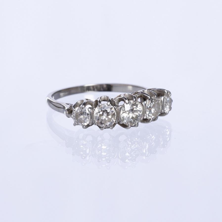 Anillo medio sin fin o cintillo en oro 18 K blanco con cinco brillantes de entre 0,35 y 0,15 ct aprox. Diámetro interno 16,5 mm. Peso bruto 3 gr.