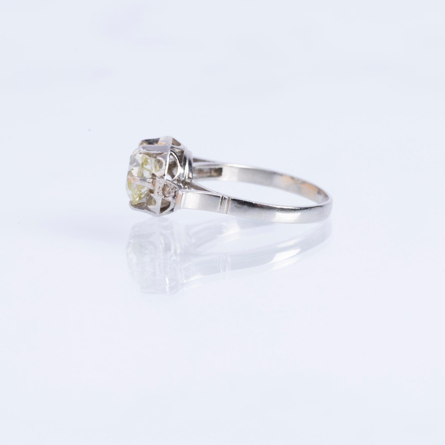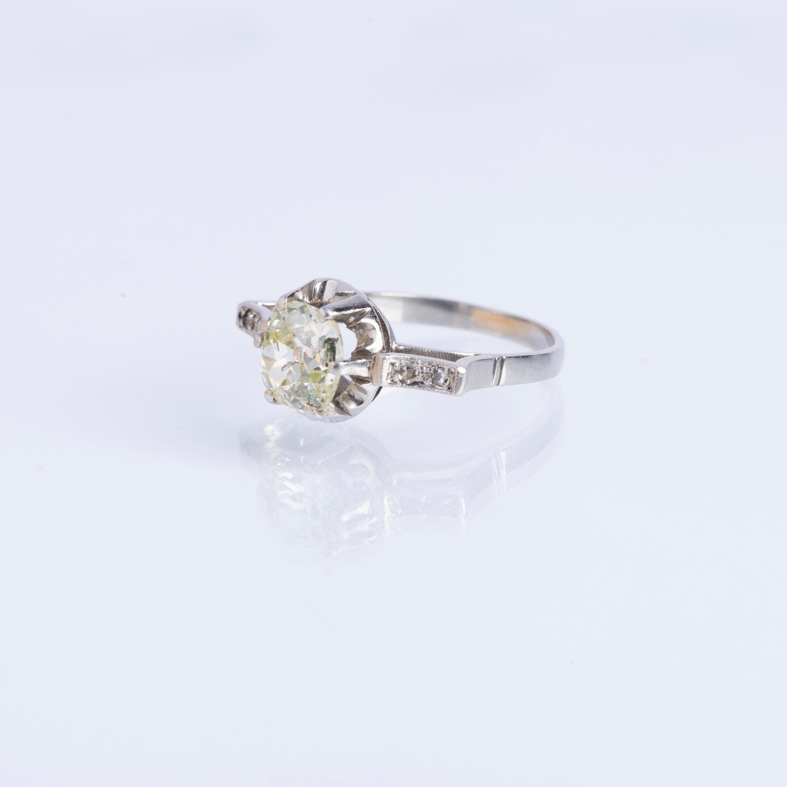 Anillo solitario en oro 18 K blanco con diamante talla brillante de 1,25 ct aprox. acompañado por cuatro pequeños diamantes laterales talla brillante. Diámetro interno 16,5 mm. Peso bruto 3,8 gr.
