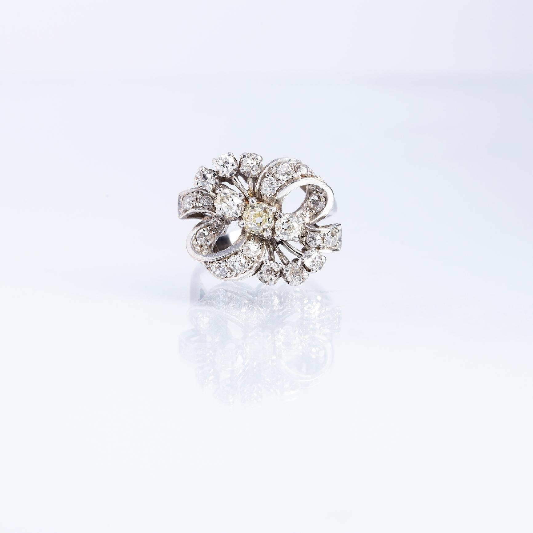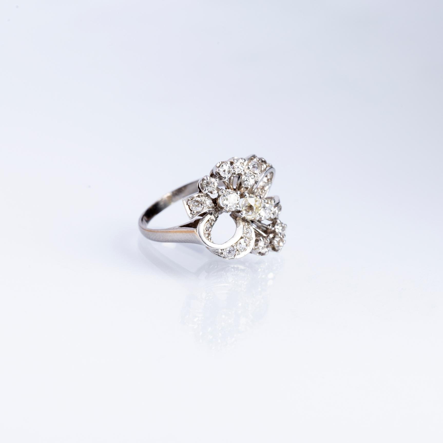 Anillo en oro 18 K blanco esculturado en forma de moño con veintitrés pequeños diamantes talla brillante. Diámetro interno 18 mm. Peso bruto 7,3 gr.