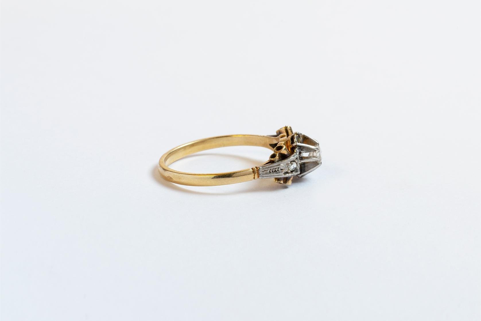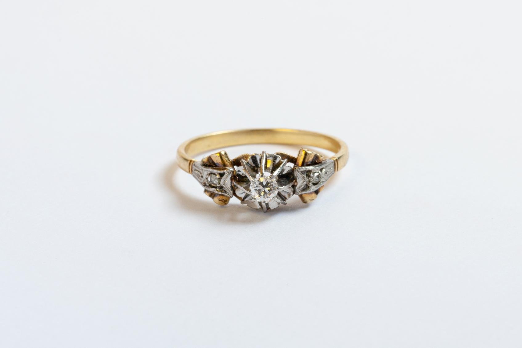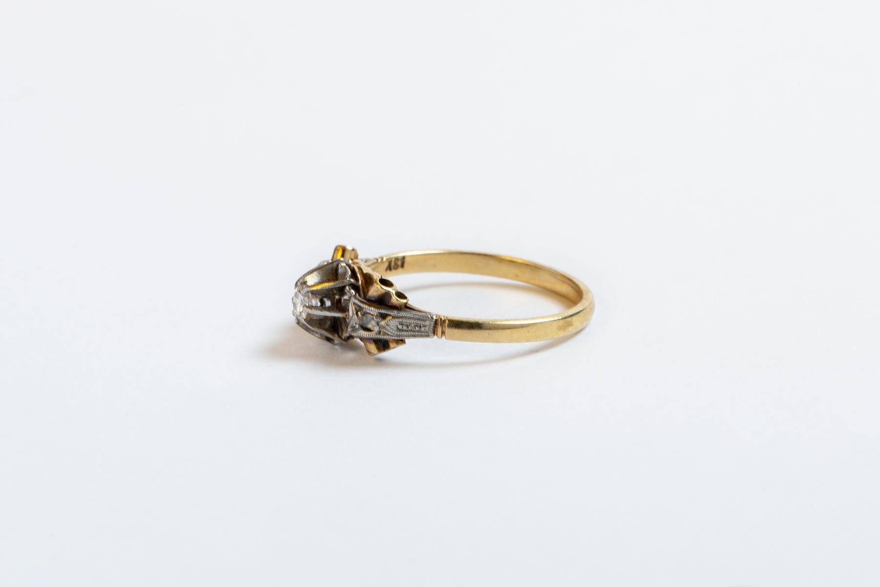 Anillo en oro 18 K amarillo y blanco decorado con pequeño brillante central y dos diamantes laterales. Diámetro interno 17.5 mm. Peso bruto 2.8 gr.