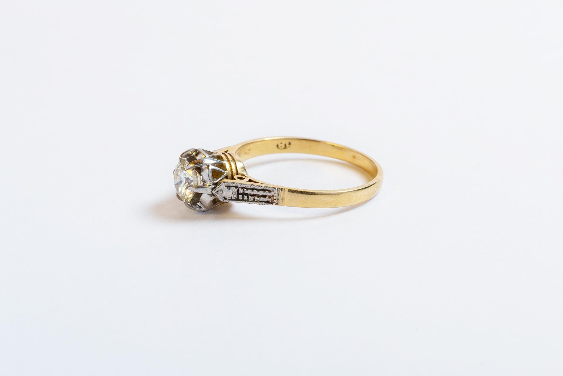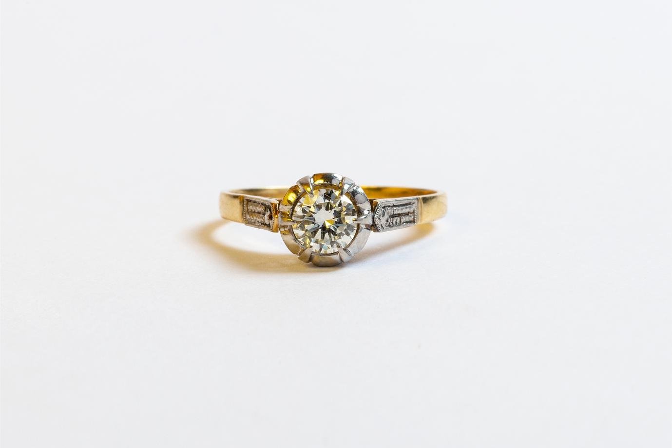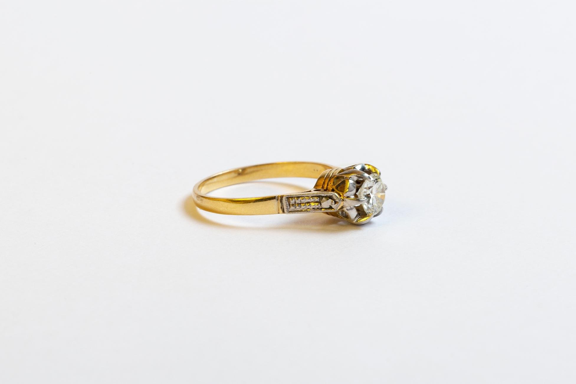 Anillo en oro 18 K amarillo y blanco decorado con pequeño brillante central y dos diamantes laterales. Diámetro interno 17.5 mm. Peso bruto 2.8 gr.