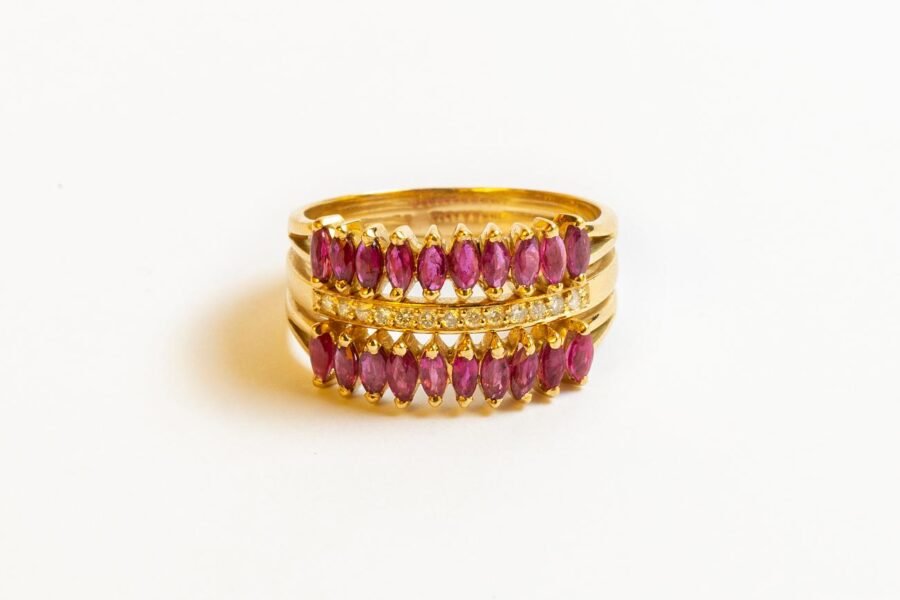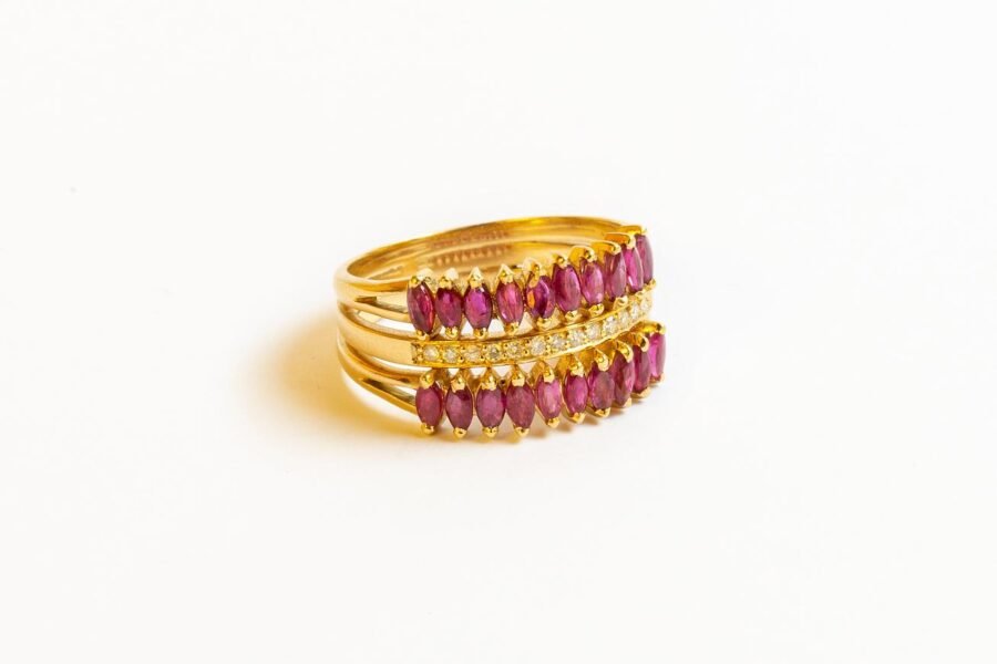 Anillo en oro 18 K amarillo con trece pequeños brillantes y veinte rubíes talla navette. Diámetro interno 20 mm. Peso bruto 8 gr.