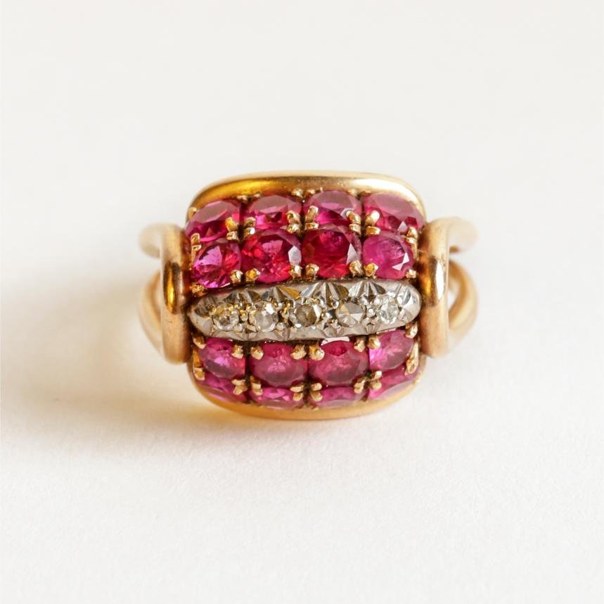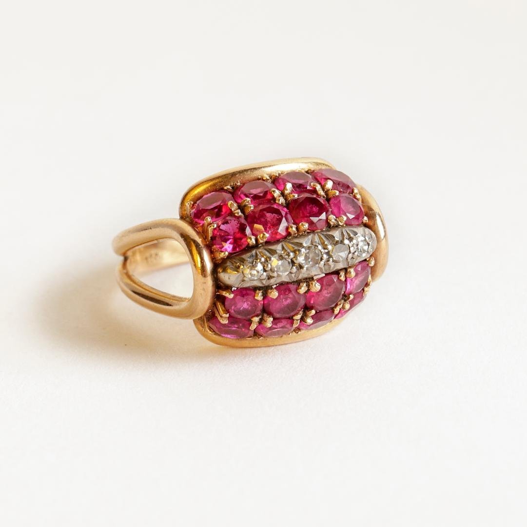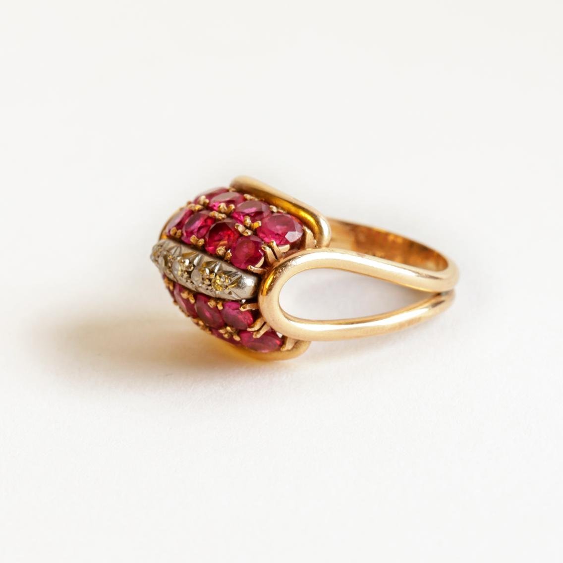 Anillo en oro 18 K amarillo con cinco pequeños brillantes y dieciséis rubíes. Diámetro interno 28 mm. Peso bruto 7.7 gr.