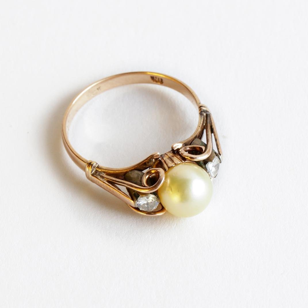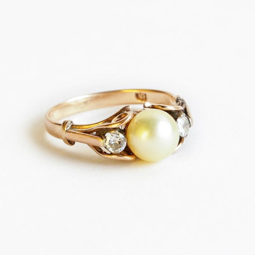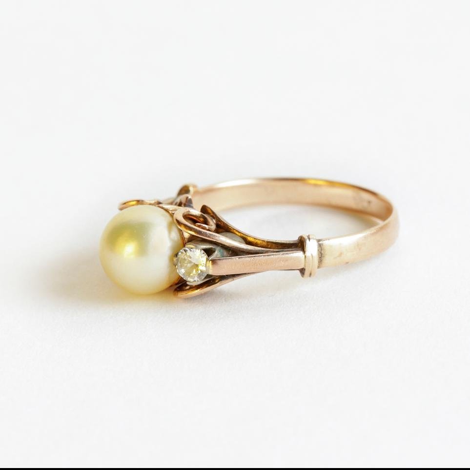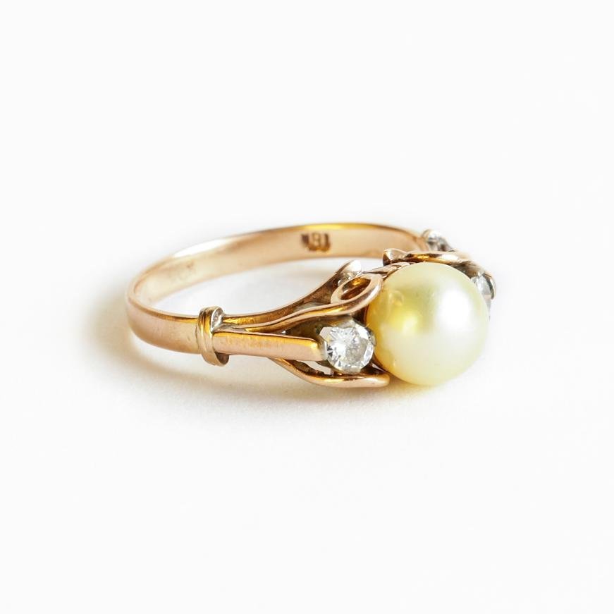 Anillo años 1940s en oro 18 K amarillo decorado con perla de cultivo central de un diámetro de 7.5 mm y dos brillantes laterales de 0.10 ct aprox. Diámetro interno 18.5 mm. Peso bruto 4 gr.