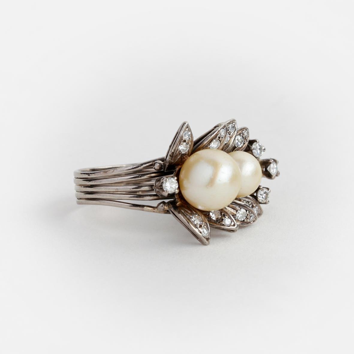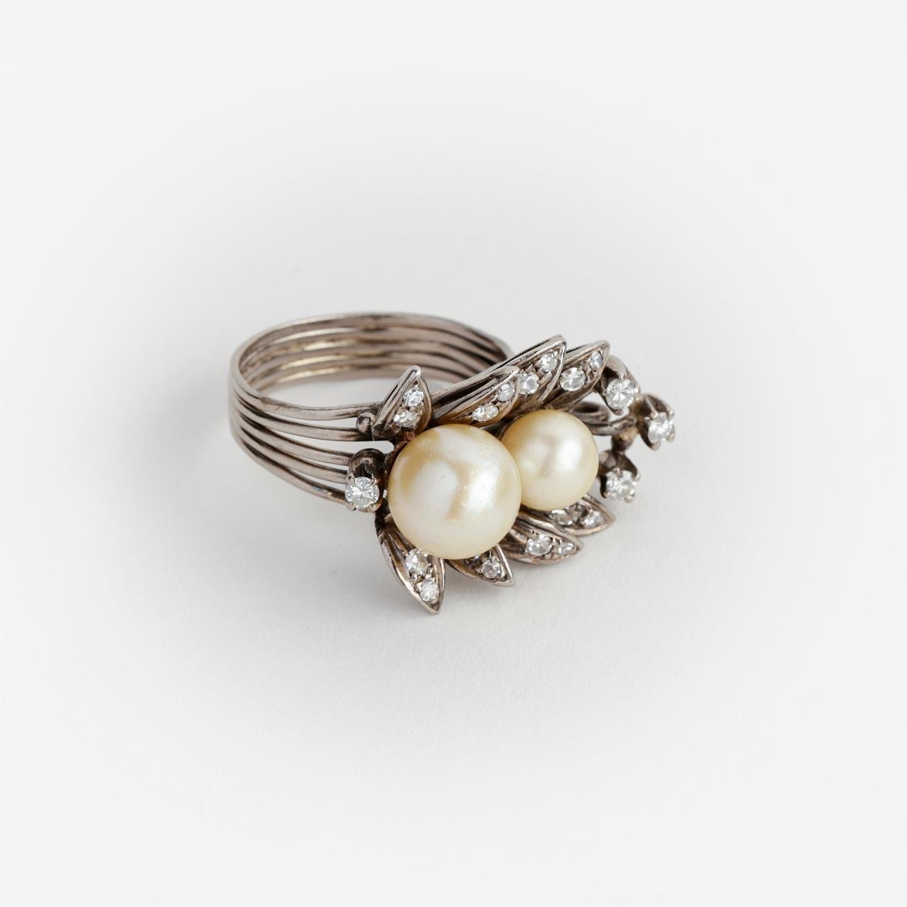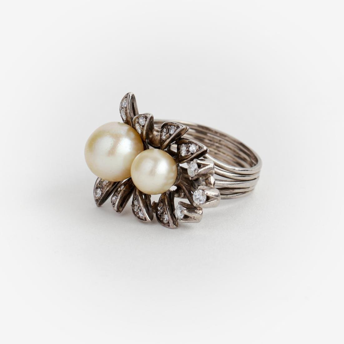 Anillo en oro 18 K blanco esculturado en forma de flor, con dos perlas de cultivo, una de 9 mm de diámetro, otra de 7 mm de diámetro, y veinte pequeños brillantes. Diámetro interno 18 mm. Peso bruto 8 gr.