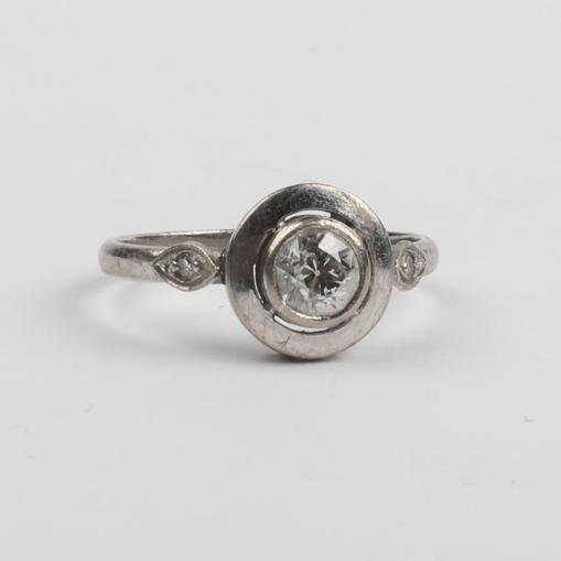 Anillo solitario oro 18 K blanco con brillante central de 0,50 ct aprox. acompañado por dos pequeños brillantes laterales. Peso bruto 3 gr. Diámetro interno 17 mm.