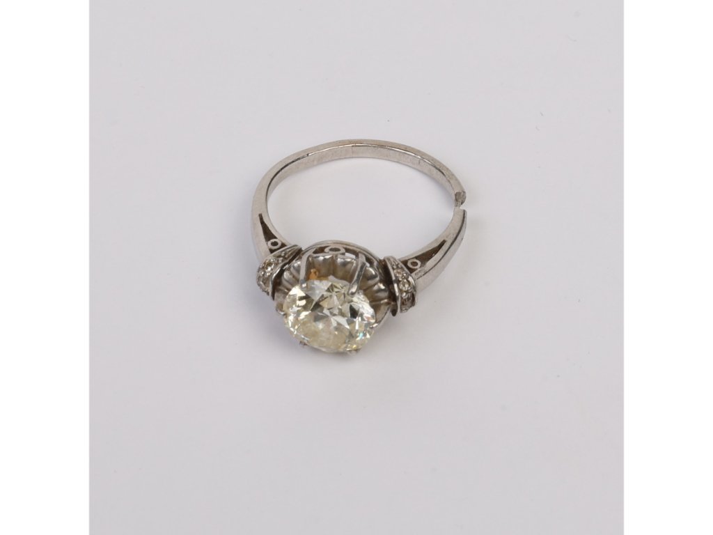 Anillo solitario en oro 18 K blanco con brillante central de 2.5 ct aprox., con cascadura lateral, acompañado por diez pequeños brillantes. Anillo cortado. Peso bruto 5 gr. Diámetro interno 16 mm.