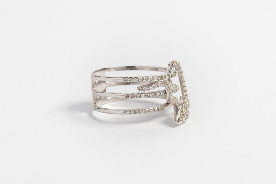 Anillo en oro 18 K blanco esculturado «serpiente», con varios pequeños brillantes. Diámetro interno 19 mm. Peso bruto 5 gr.