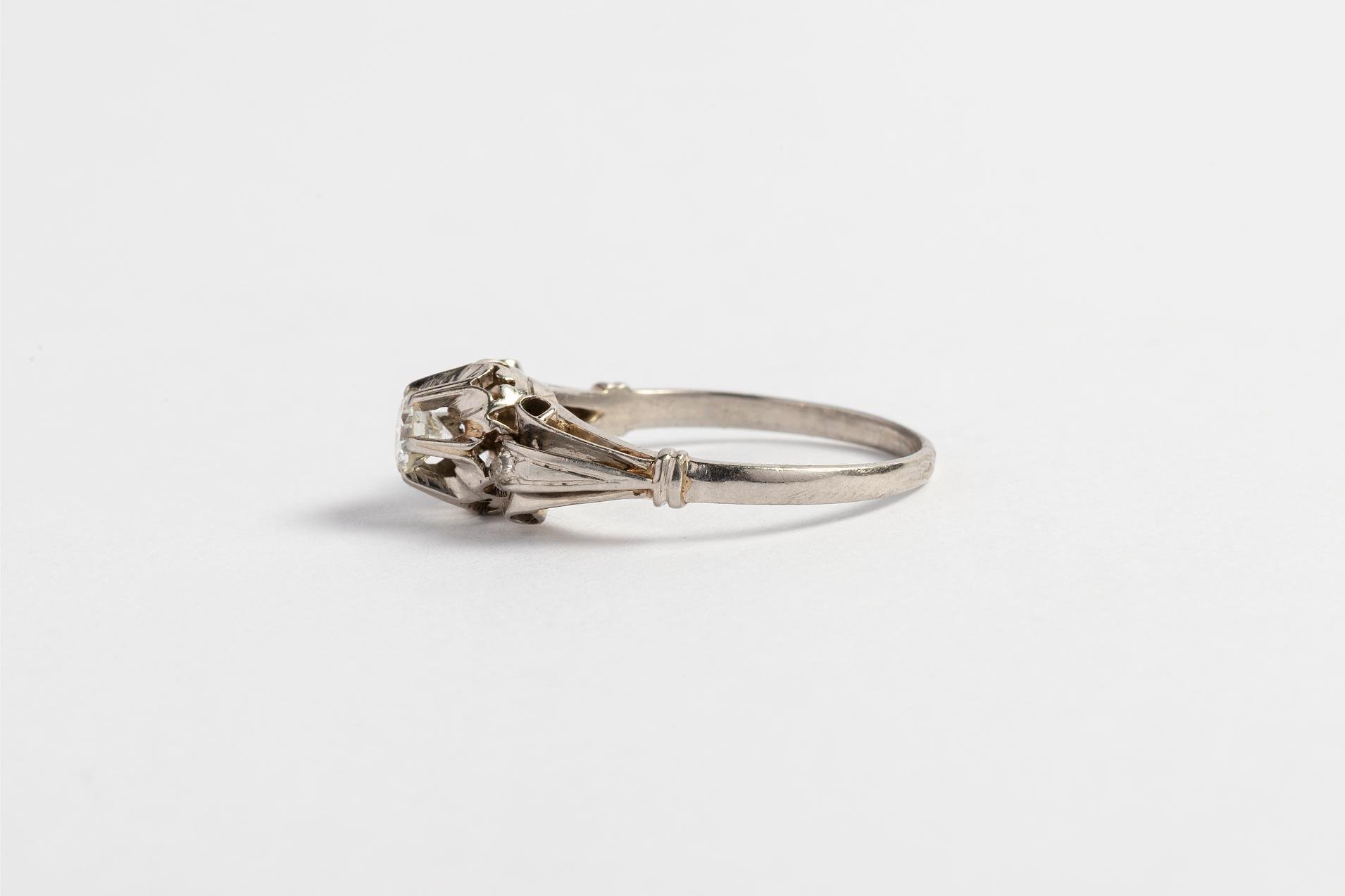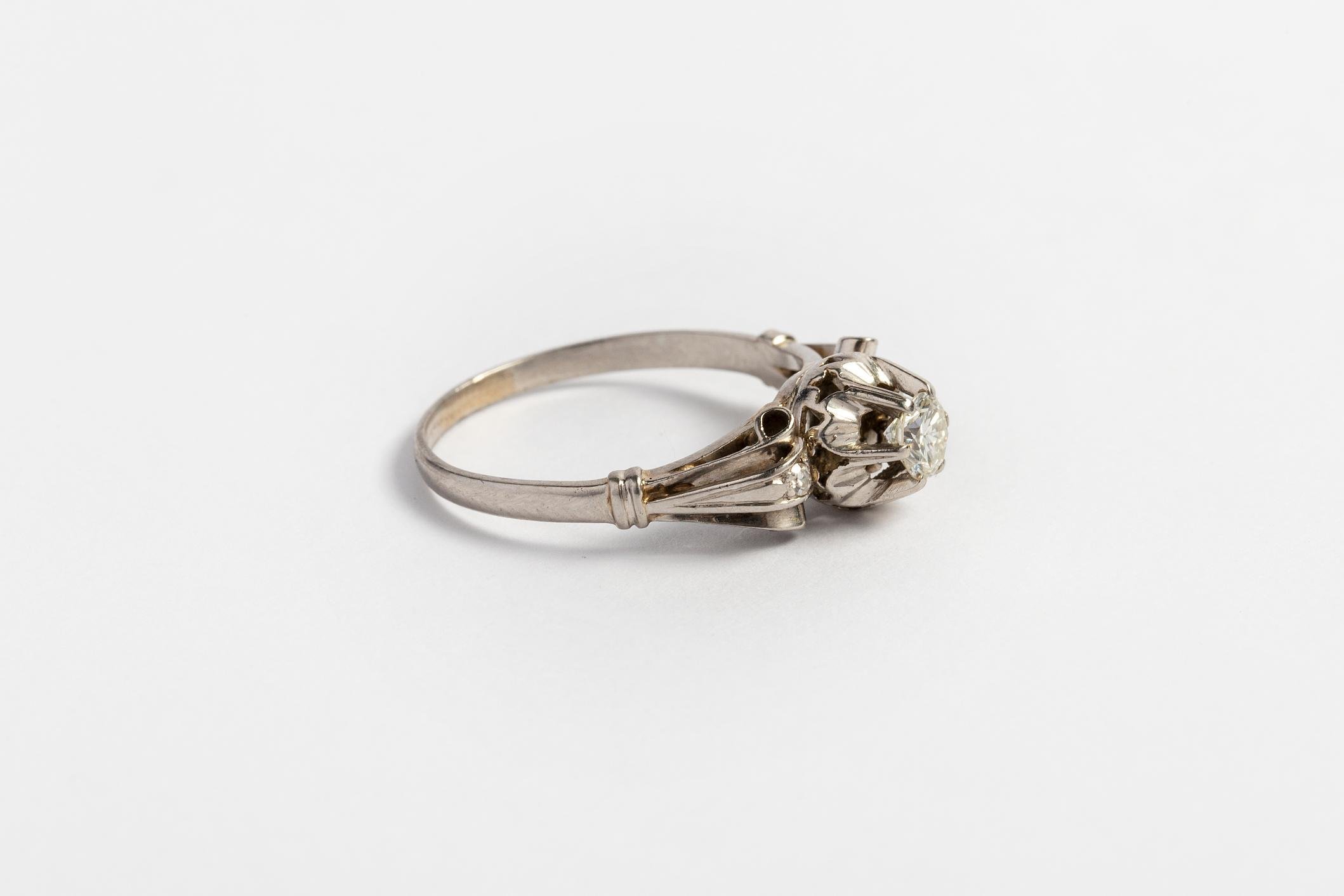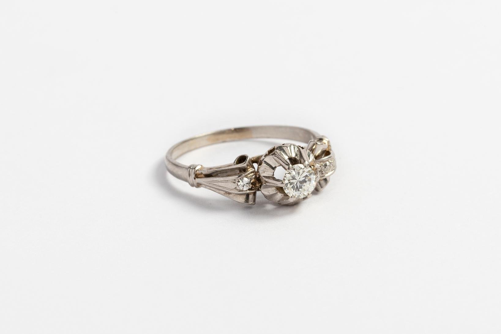 Anillo en oro 18 K blanco con brillante central de 0.35 ct aprox. y dos pequeños brillantes laterales. Diámetro interno 17.5 mm. Peso bruto 4 gr.