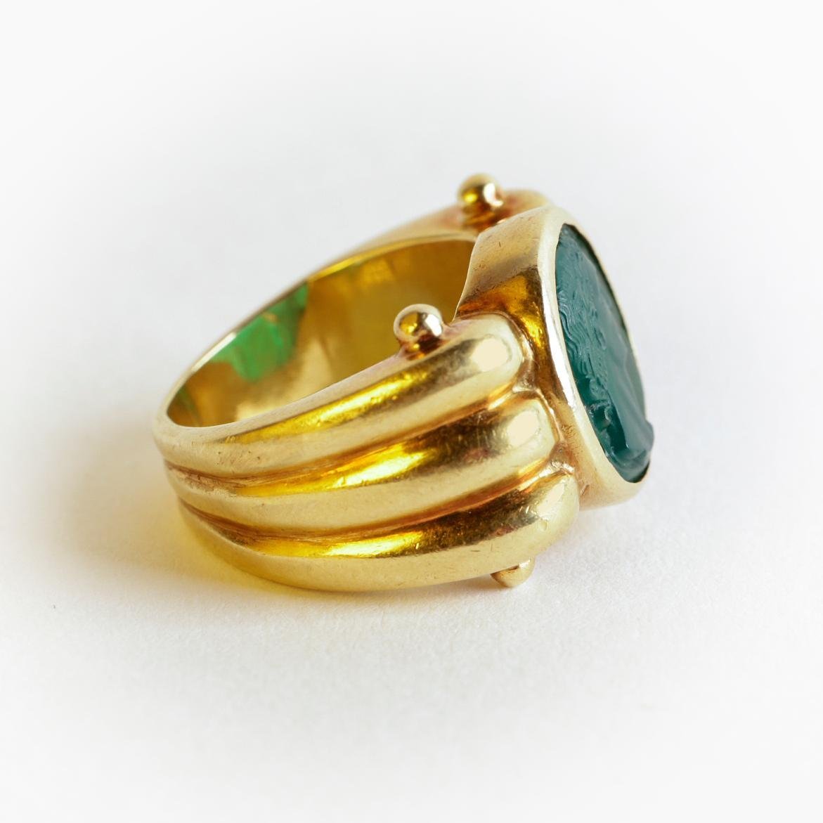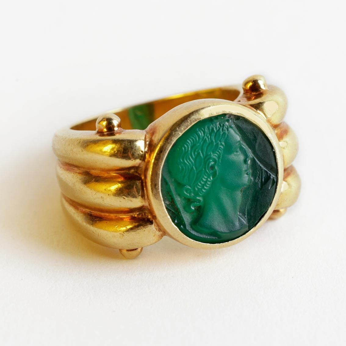 Anillo en oro 18 K amarillo con medallón en cristal de color verde decorado “dama”. Diámetro interno 17 mm. Peso bruto 11.9 gr.