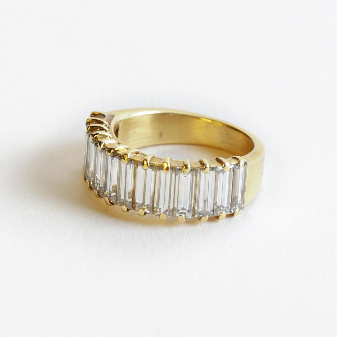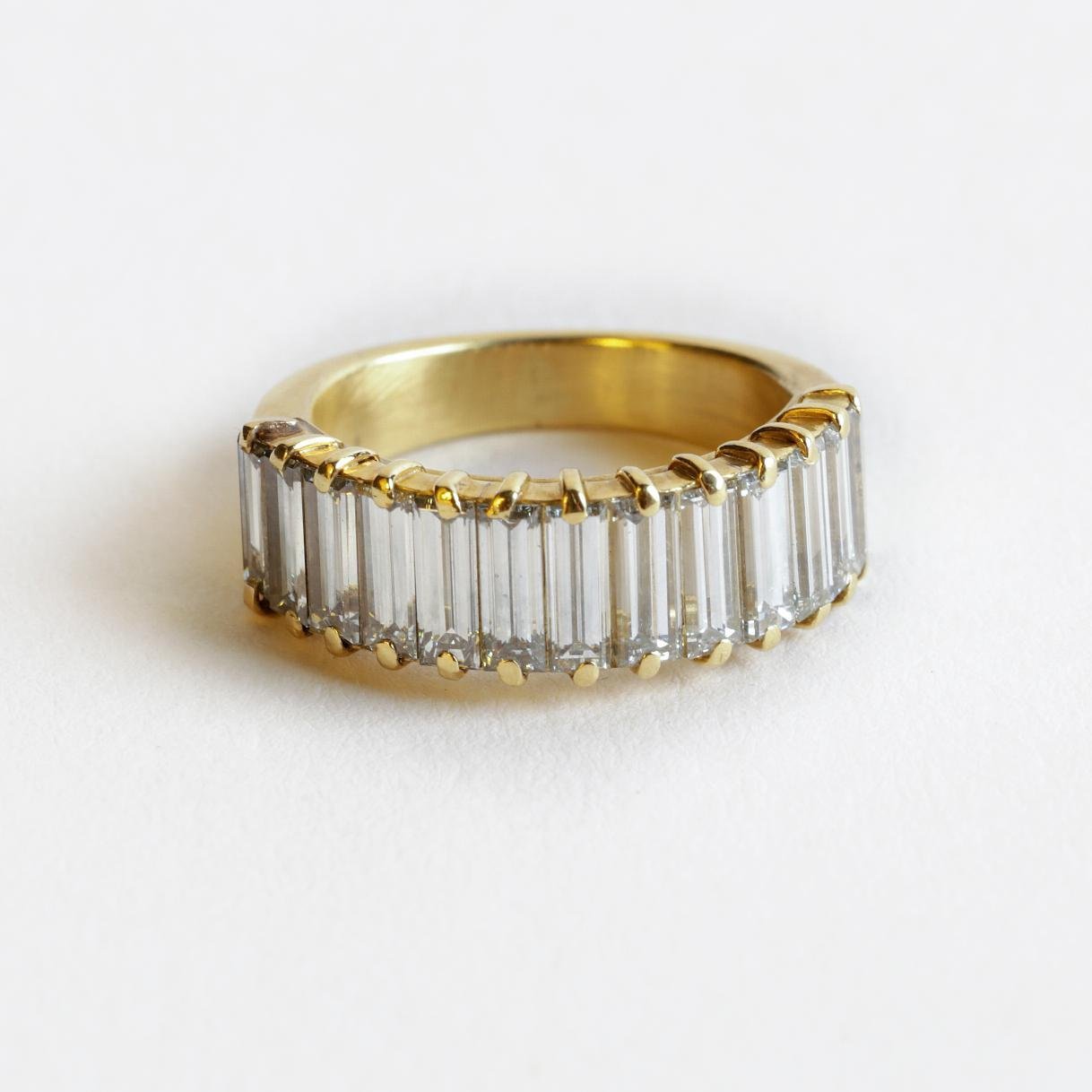Anillo medio sin fin en oro 18 K amarillo con trece diamantes color I talla baguette de 0.20 ct aprox. cada uno. Peso bruto 6.5 gr. Diámetro interno 16.5 mm.