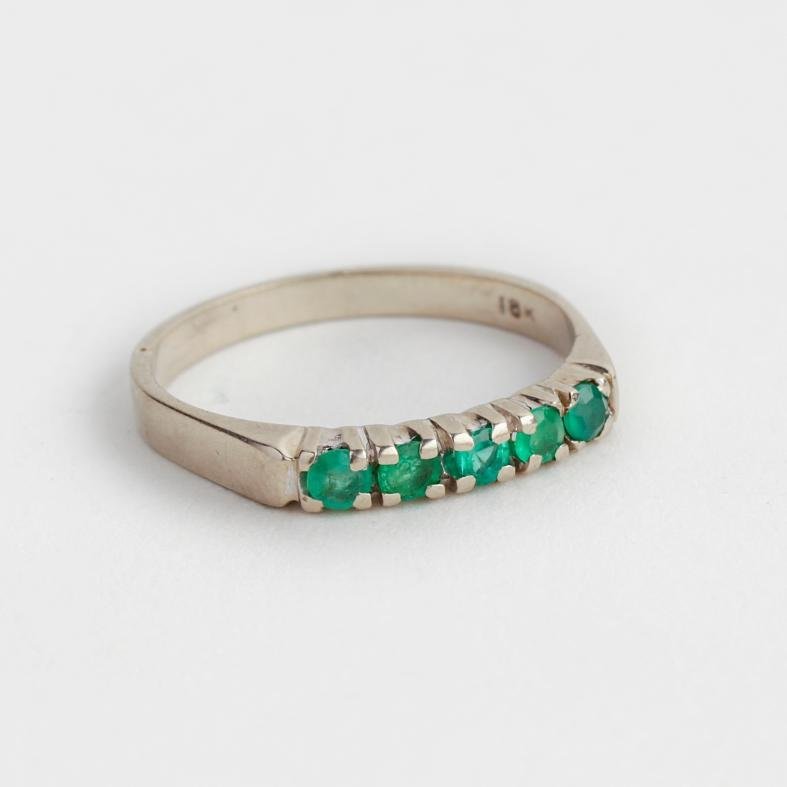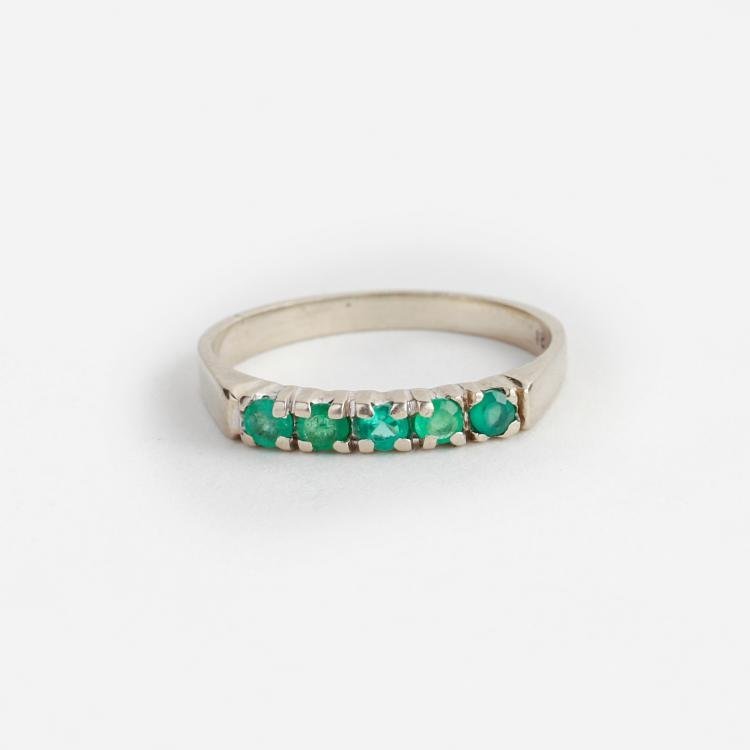 Anillo medio sin fin en oro 18 K blanco con cinco pequeñas esmeraldas talla redonda. Diámetro interno 17 mm. Peso bruto 1.8 gr.