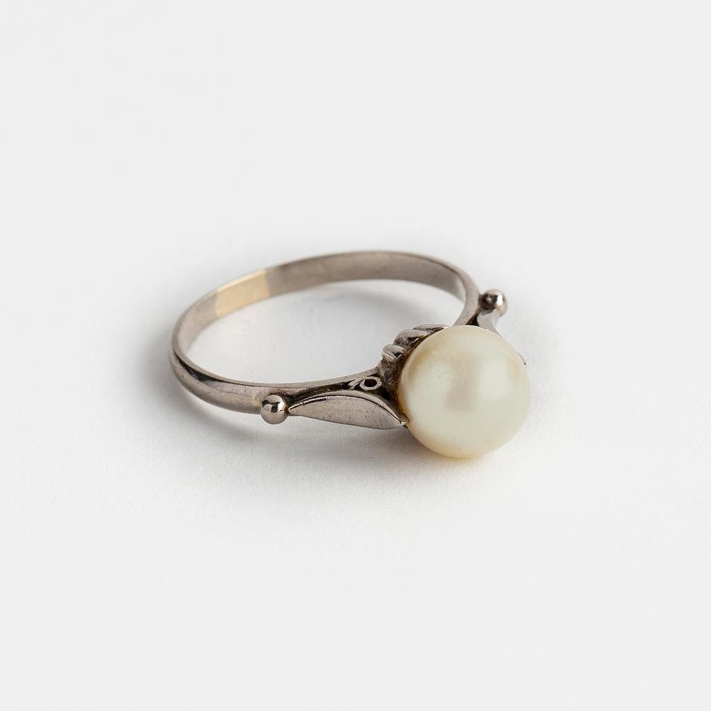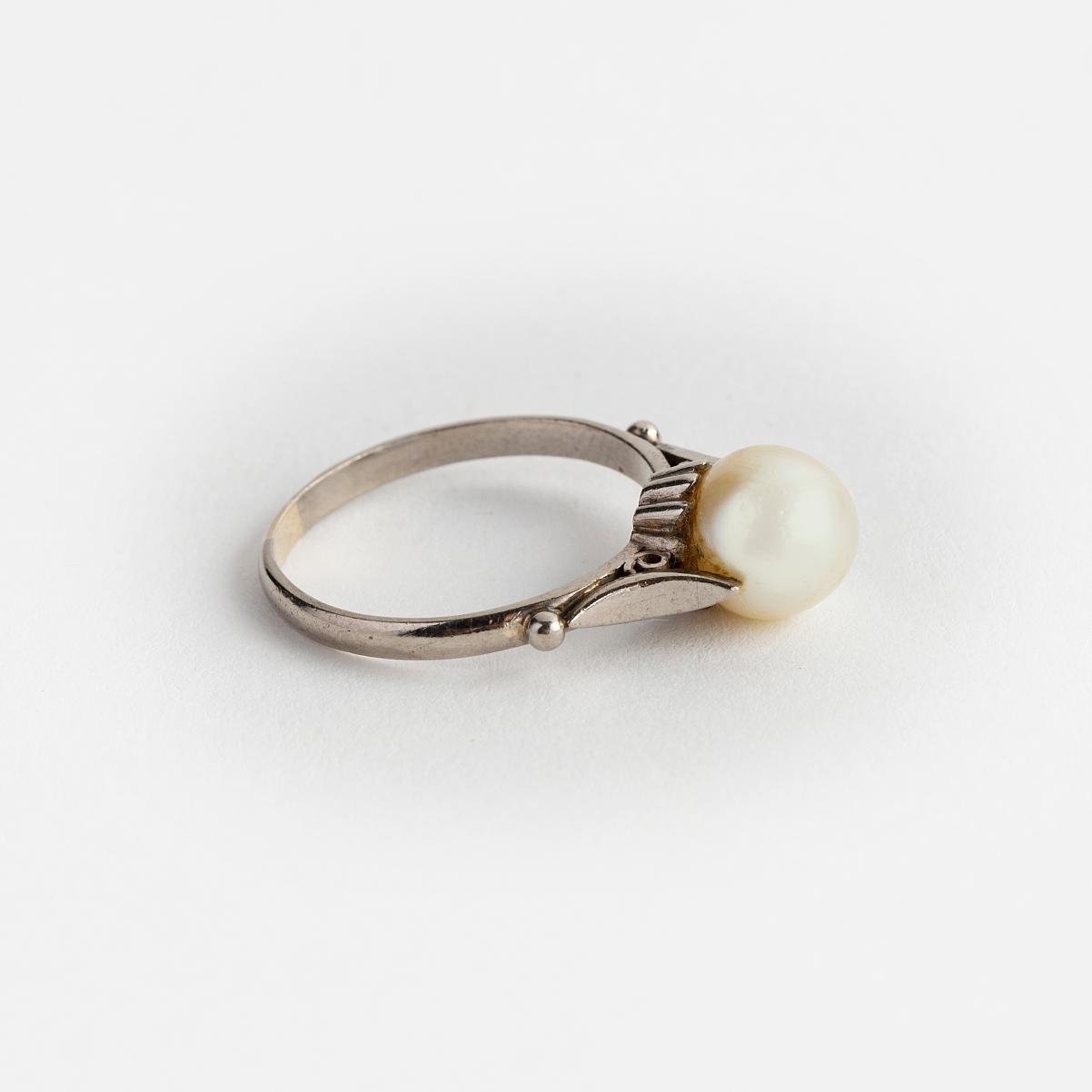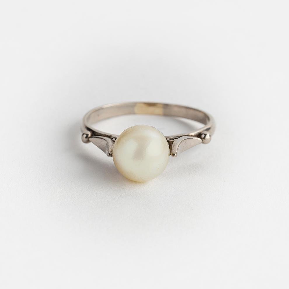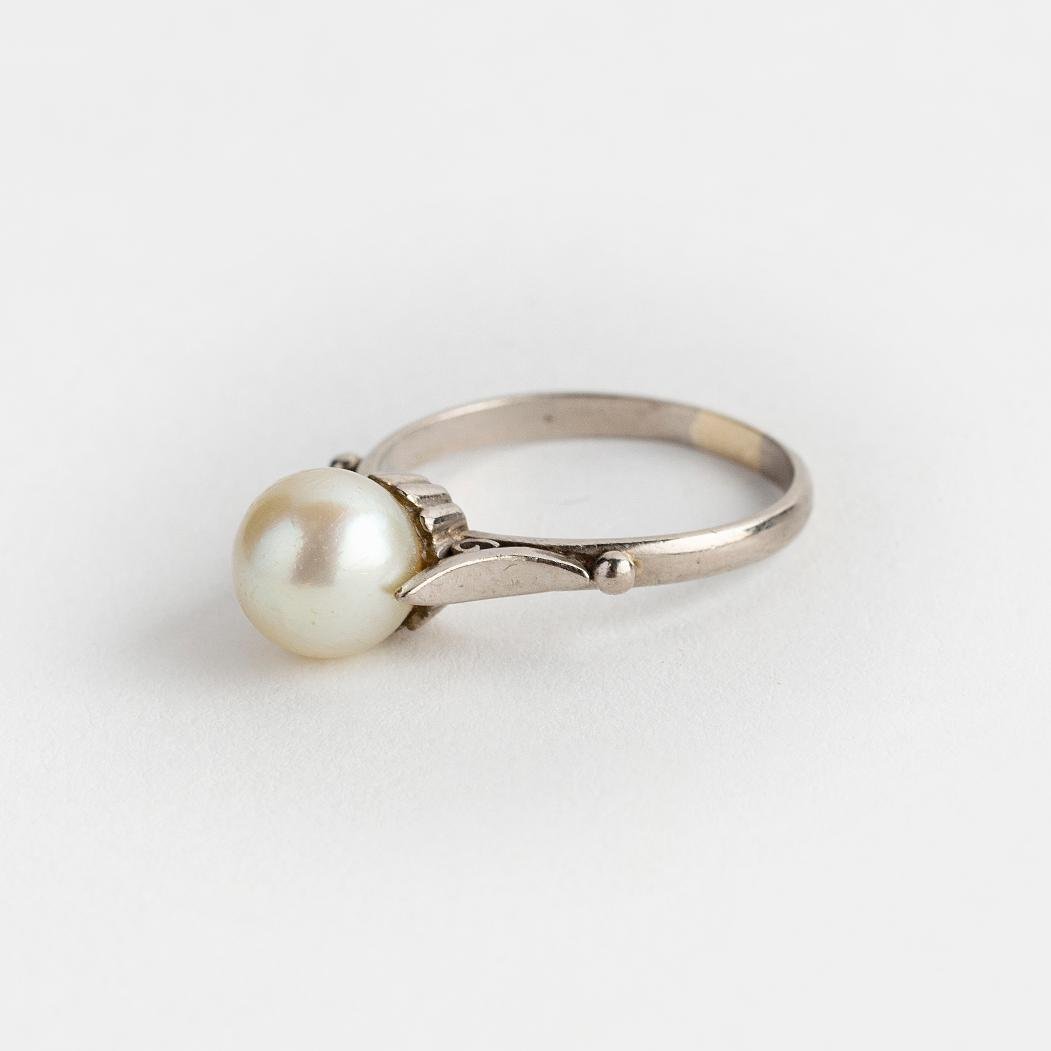 Anillo en oro 18 K blanco con perla de cultivo central de un diámetro de 8 mm. Diámetro interno 19 mm. Peso bruto 4 gr.