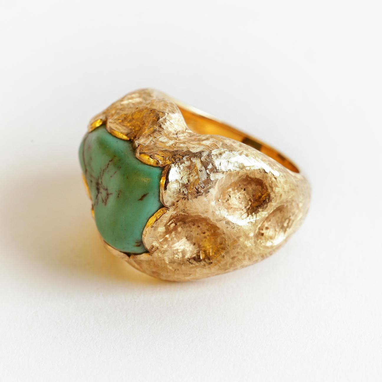 Anillo en oro 18 K amarillo decorado con turquesa central. Diámetro interno 16 mm. Peso bruto 11 gr.