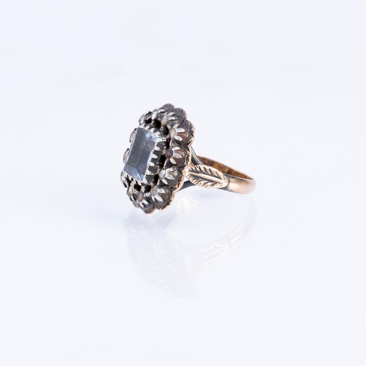 Anillo s. XIX en oro amarillo con monturas en plata, con una aguamarina central talla esmeralda y doce diamantes laterales talla brillante. Diámetro interno 19 mm. Peso bruto 7 gr.