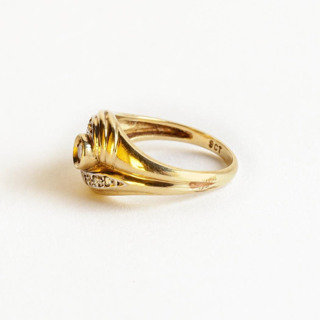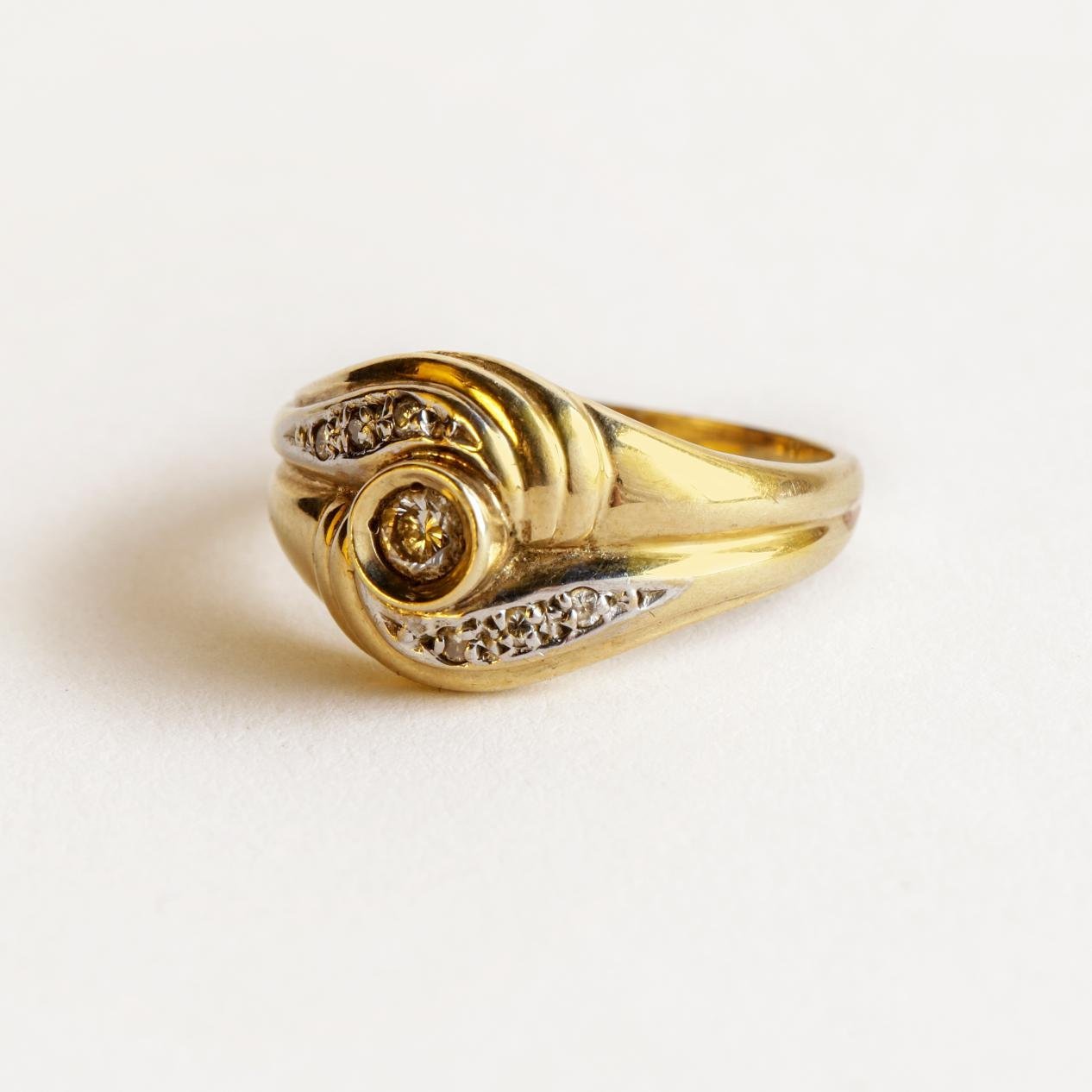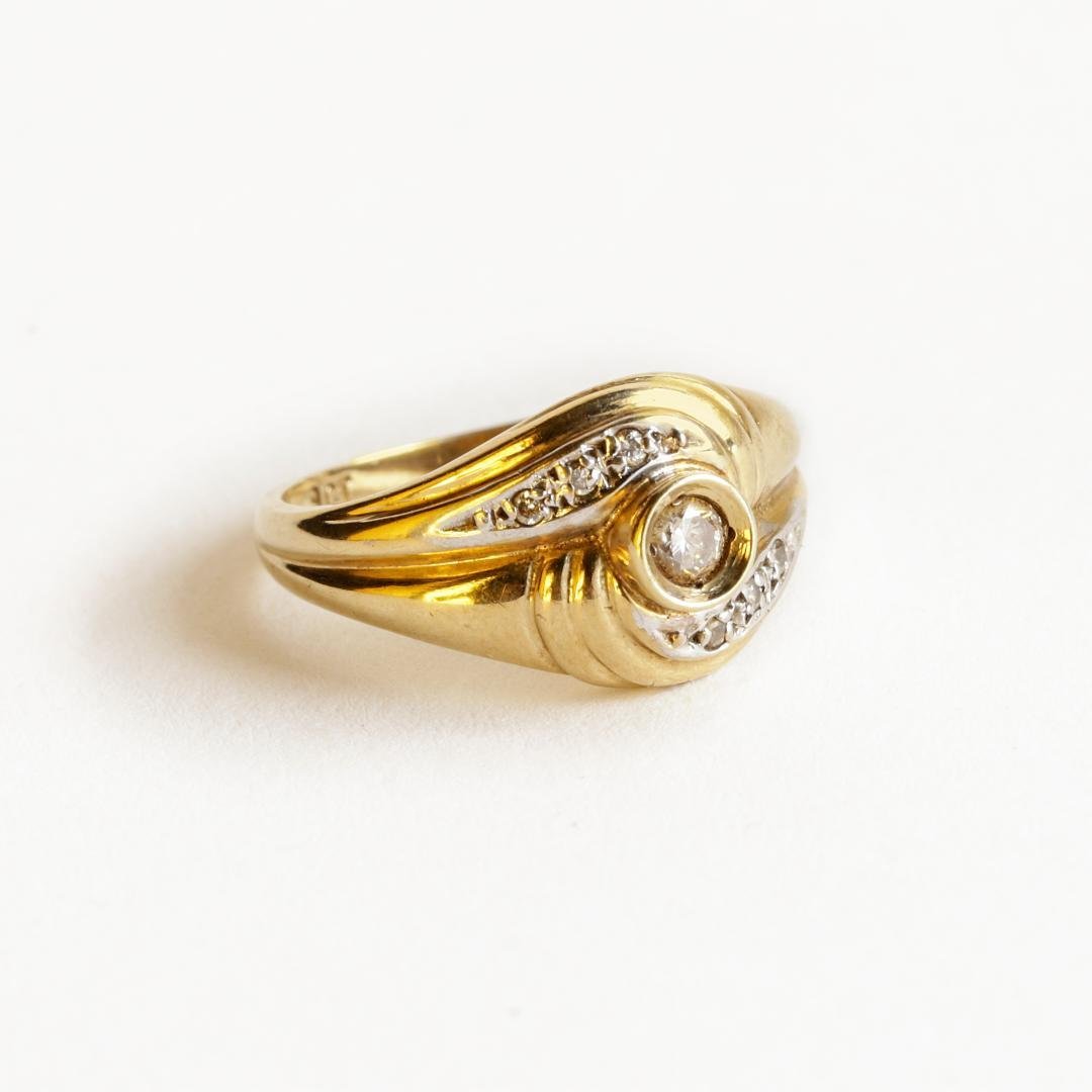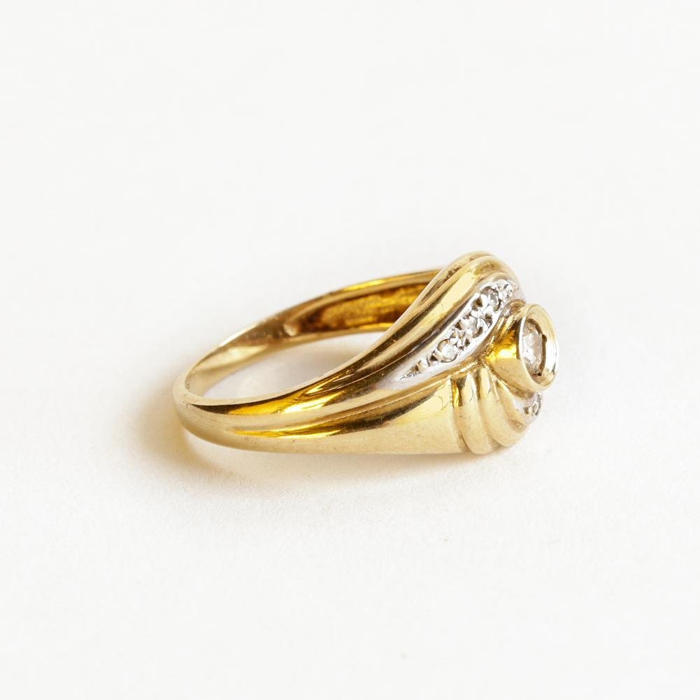 Anillo en oro amarillo decorado con siete pequeños brillantes, el central de 0.15 ct aprox. Diámetro interno 18 mm. Peso bruto 3.8 gr.