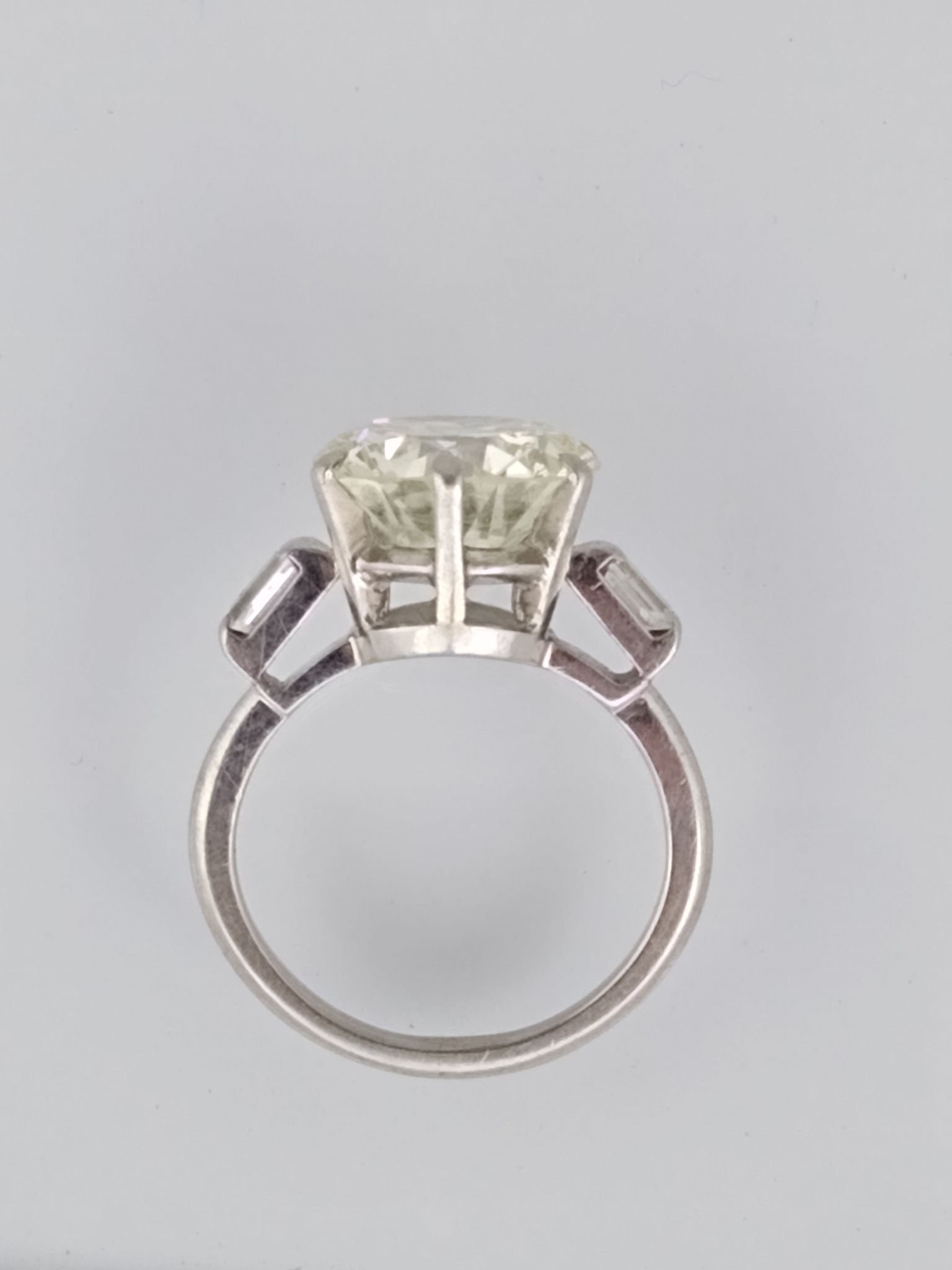 Anillo solitario en platino con brillante central de 4.40 ct aprox. de 10.90 x 6.35 mm y dos diamantes laterales talla baguette. Diámetro interno 16 gr. Peso bruto 6 gr.