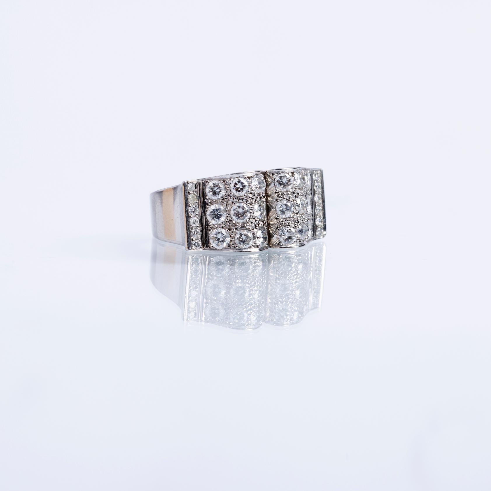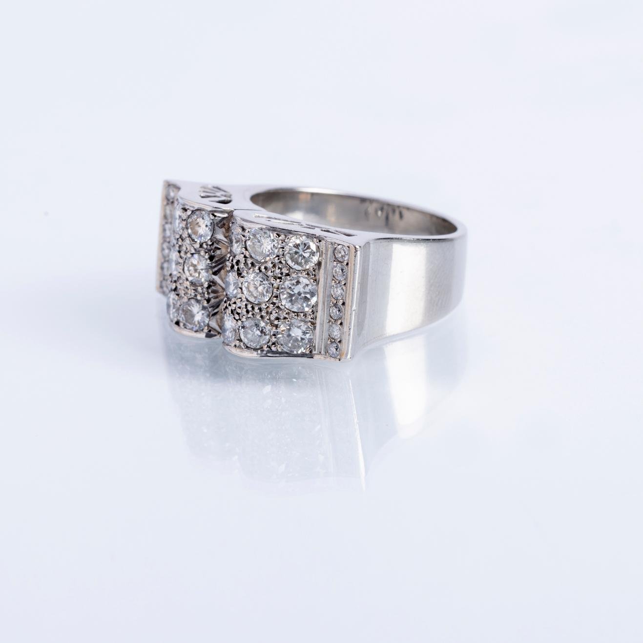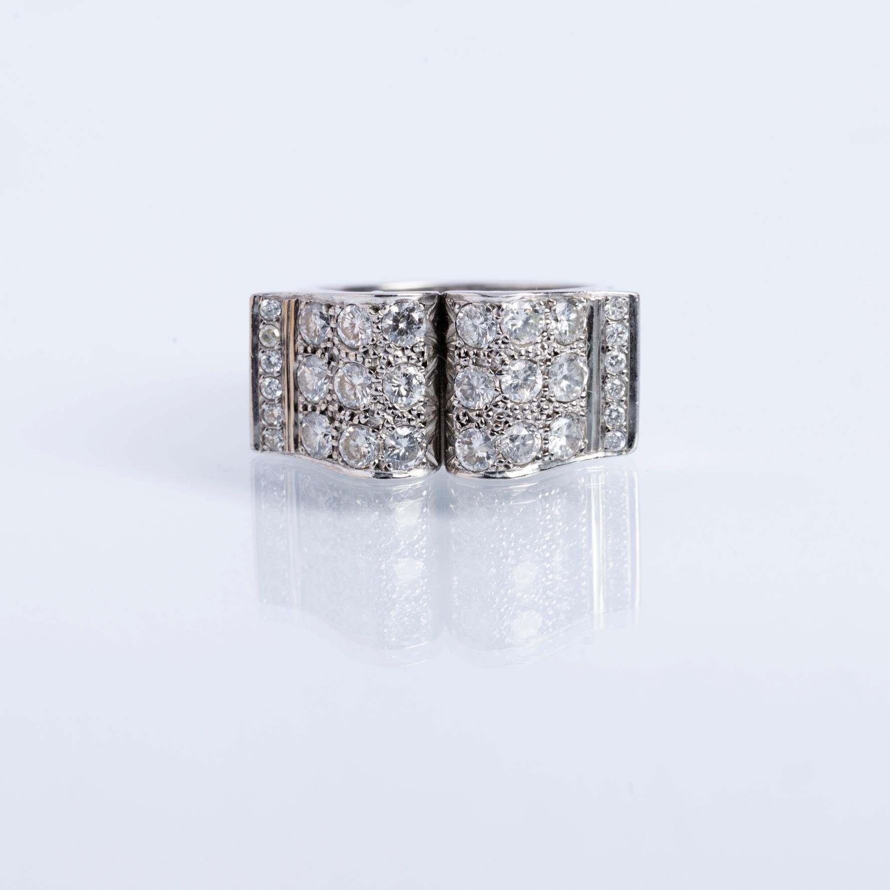 Anillo en platino con mesa rectangular totalmente decorada con treinta pequeños diamantes talla brillante. Diámetro interno 17,5 mm. Peso bruto 13,3 gr.