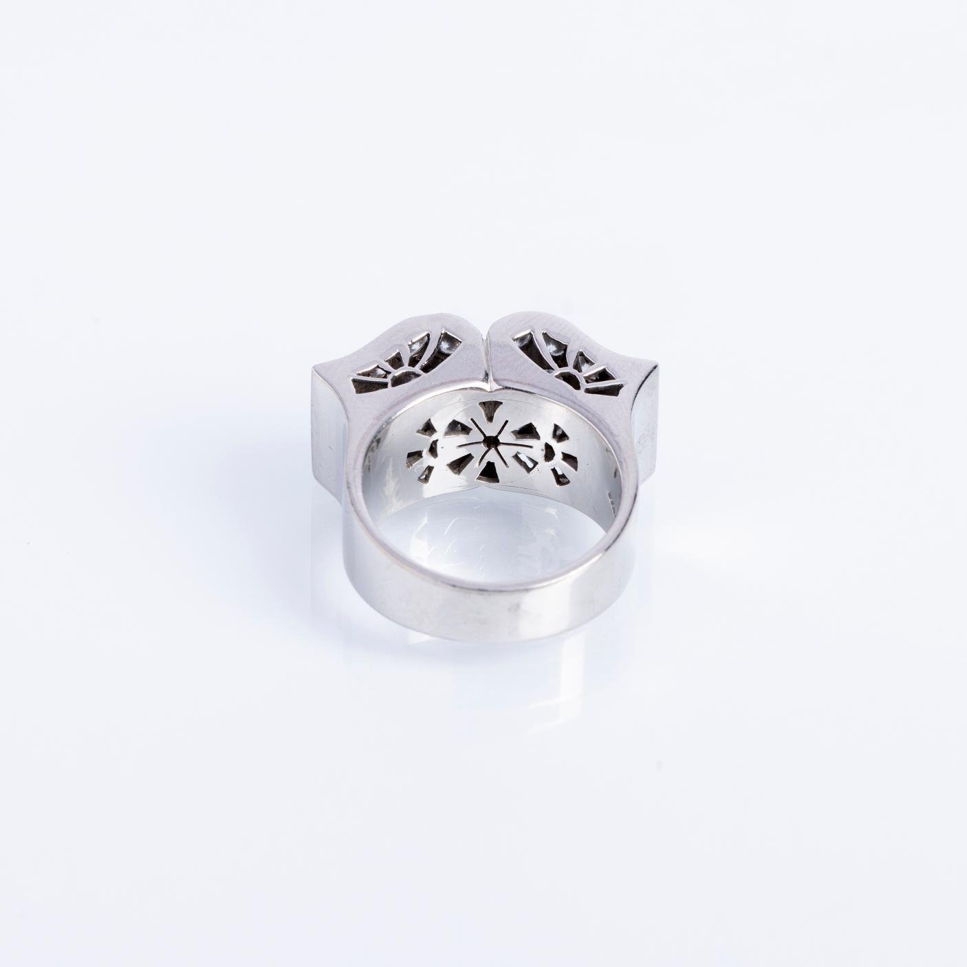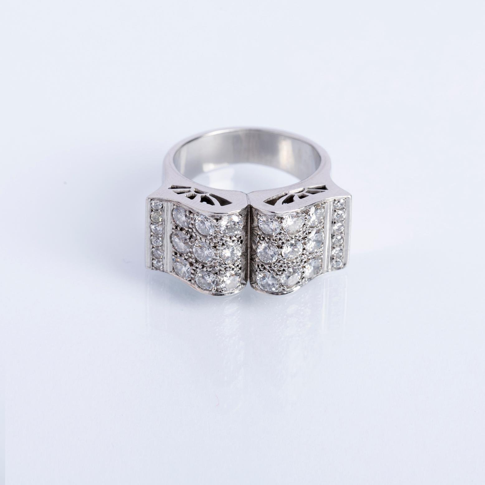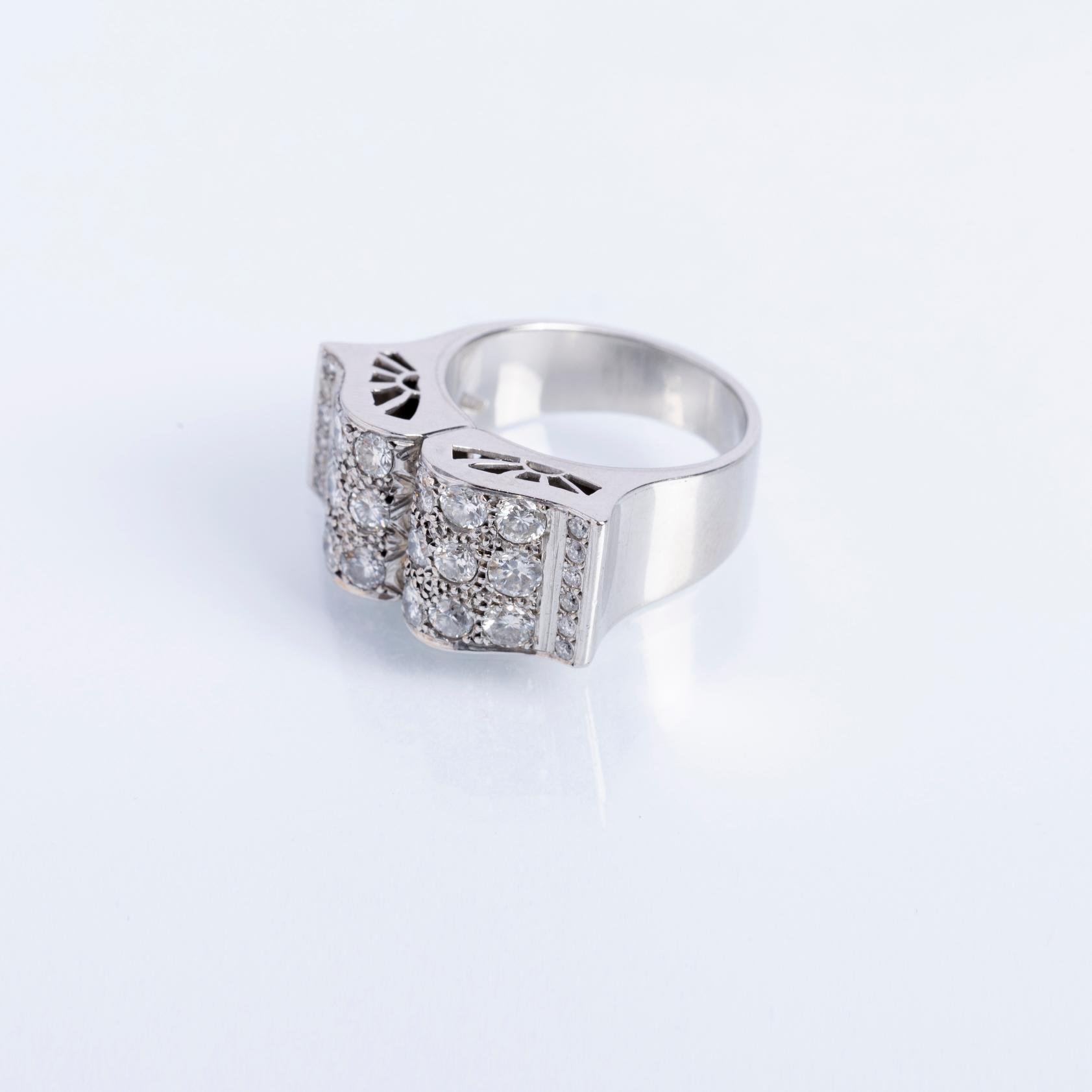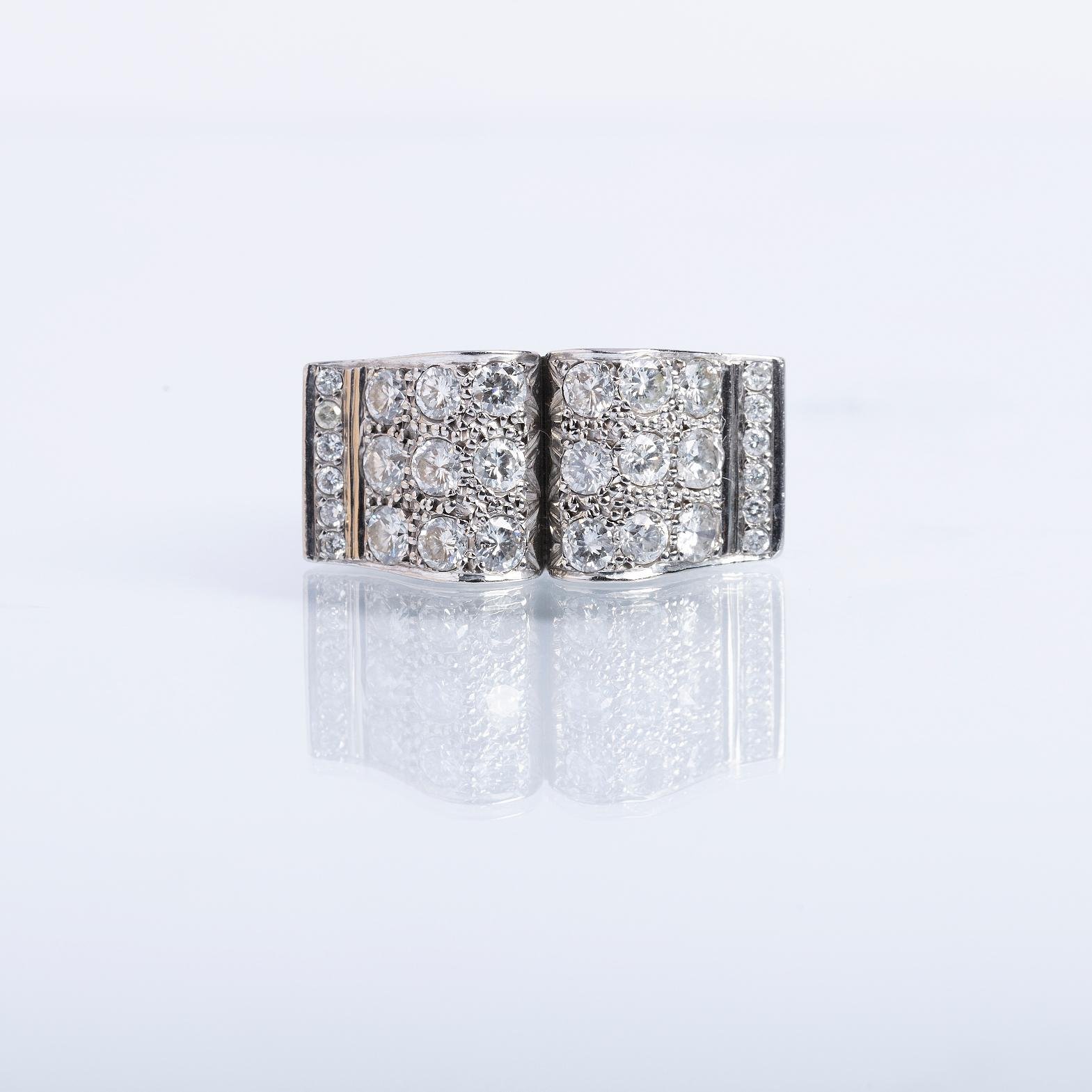 Anillo en platino con mesa rectangular totalmente decorada con treinta pequeños diamantes talla brillante. Diámetro interno 17,5 mm. Peso bruto 13,3 gr.