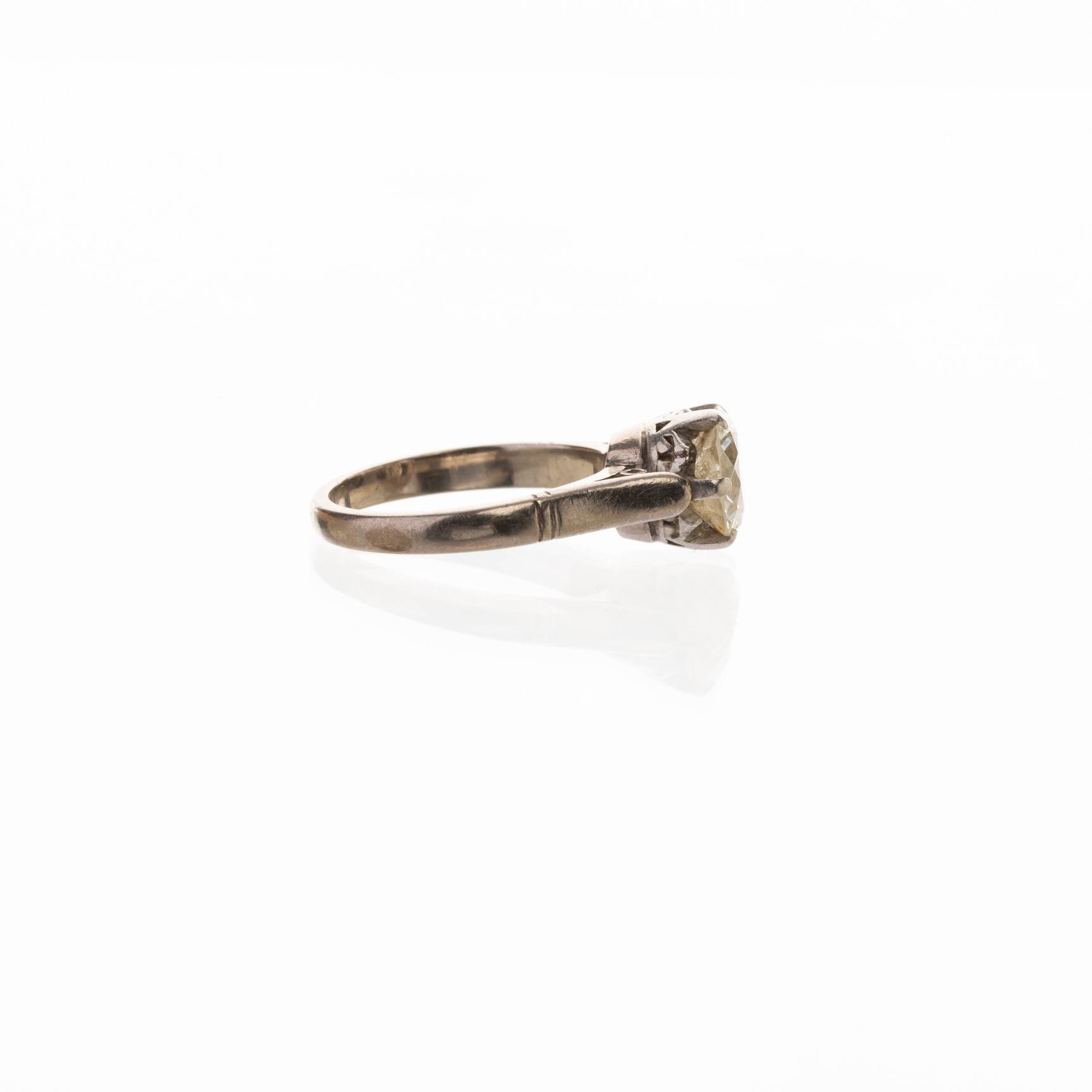 Anillo solitario en oro 18 K blanco con brillante de 1,50 ct aprox. Diámetro interno 15,5 mm. Peso bruto 3,40 gr.