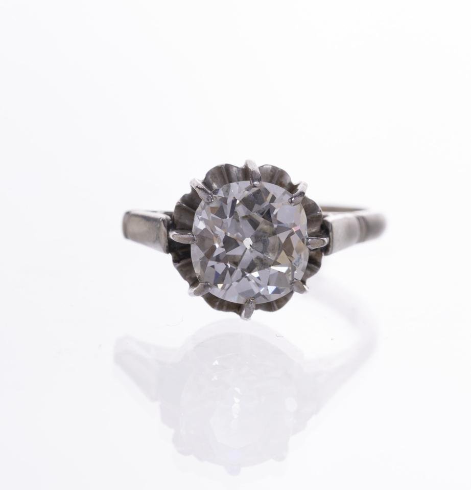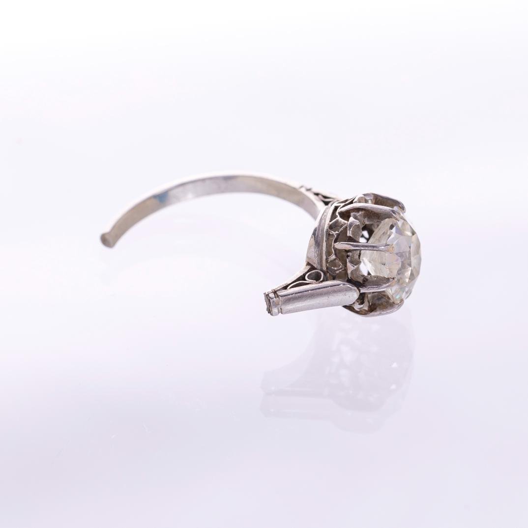 Anillo solitario en oro 18 K blanco con diamante talla brillante de 1,60 ct aprox. (7,7 x 4,5 mm). Diámetro interno 18 mm. Peso bruto 3,40 gr. Anillo cortado, con faltante.