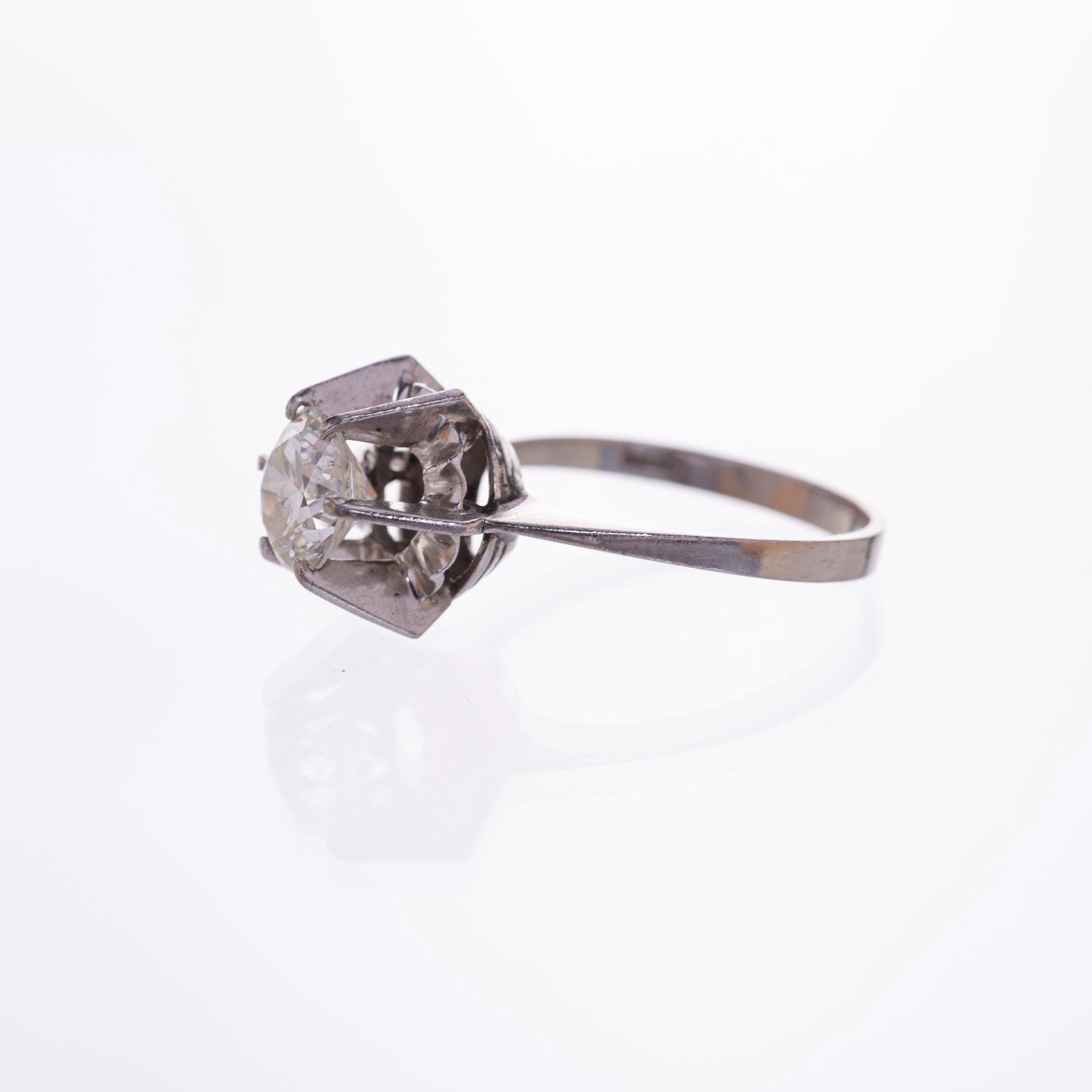 Anillo solitario en oro 18 K blanco con diamante talla brillante de 1,50 ct aprox. (7,20 x 4,60 mm). Diámetro interno de 17 mm. Peso bruto 3,5 gr.