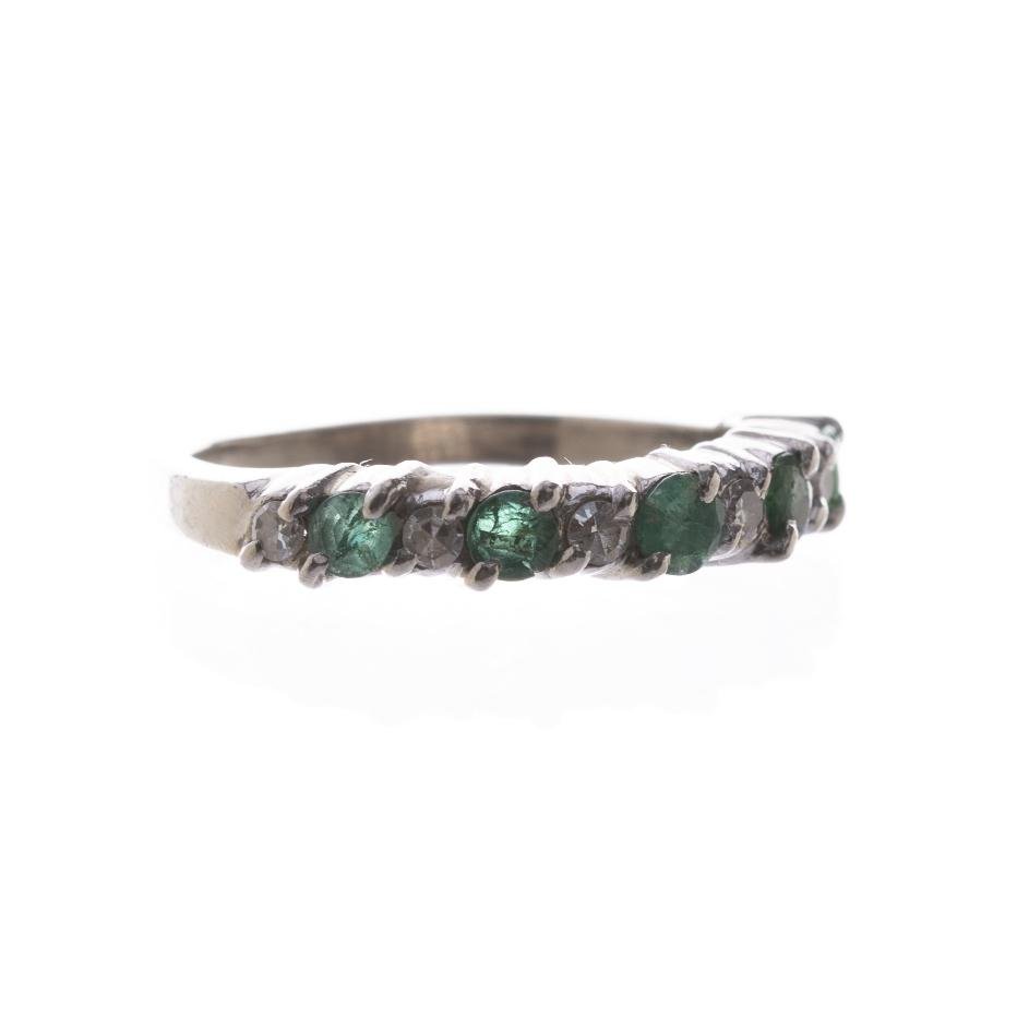 Anillo medio sin fin en oro 18 K blanco con seis pequeños diamantes talla brillante y cinco esmeraldas. Diámetro interno 18 mm. Peso bruto 4,8 gr.