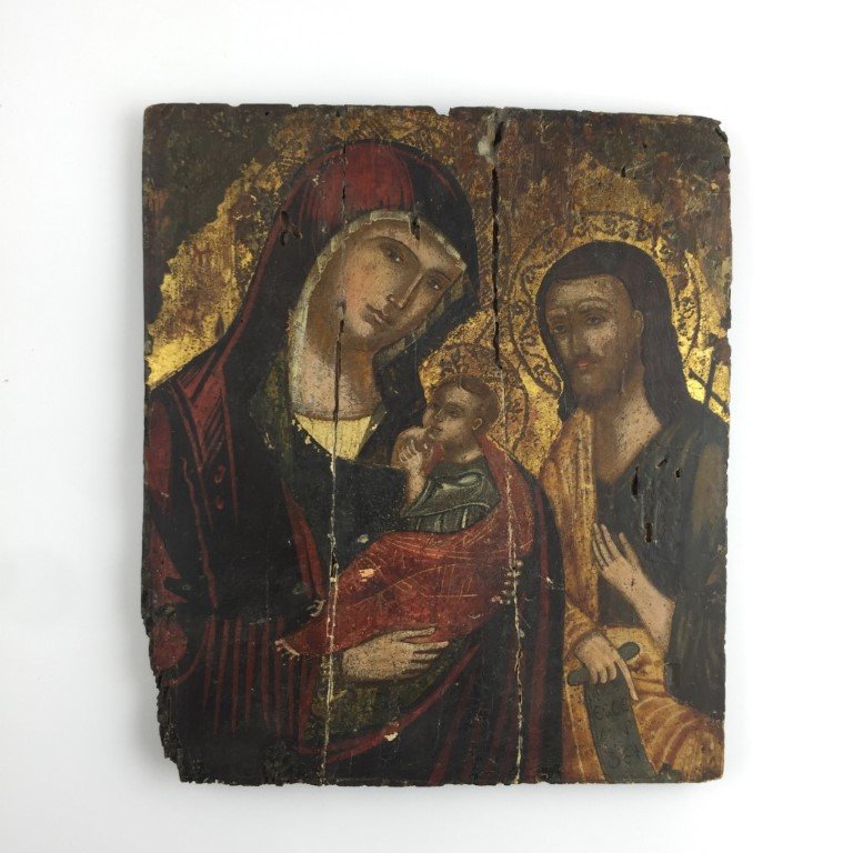 Anónimo siglo XVIII. Óleo y lámina de óleo sobre tabla, restaurada. «Virgen María con niño Jesús y apóstol.» 28.5 x 25 cm.