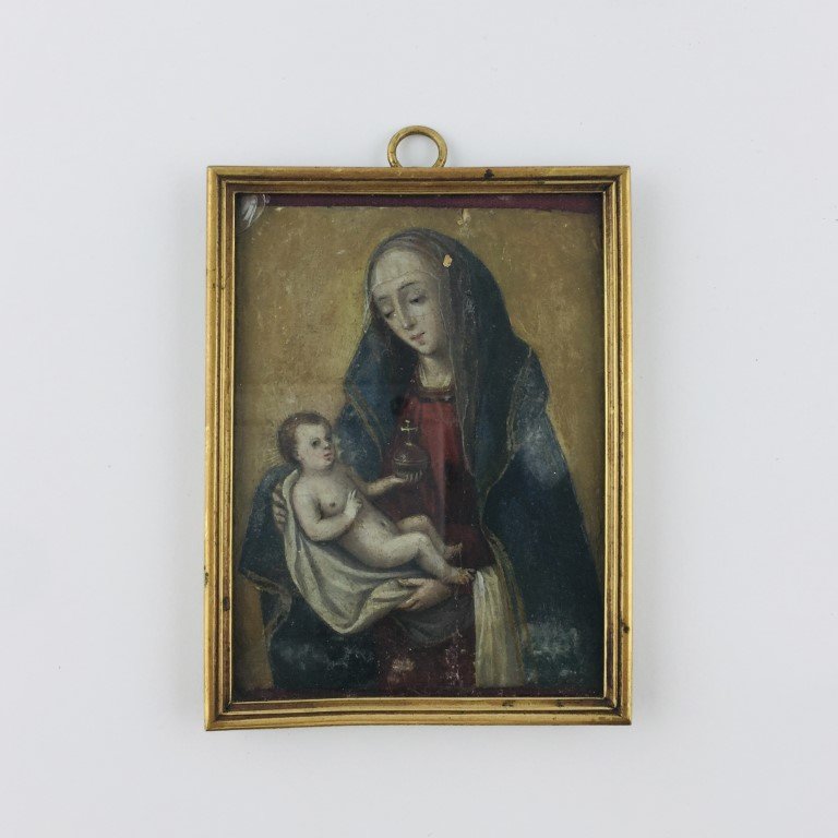 Miniatura europea pintada a mano (siglo XVIII). Óleo sobre cartón. «Virgen con Niño.» 8 x 6 cm.