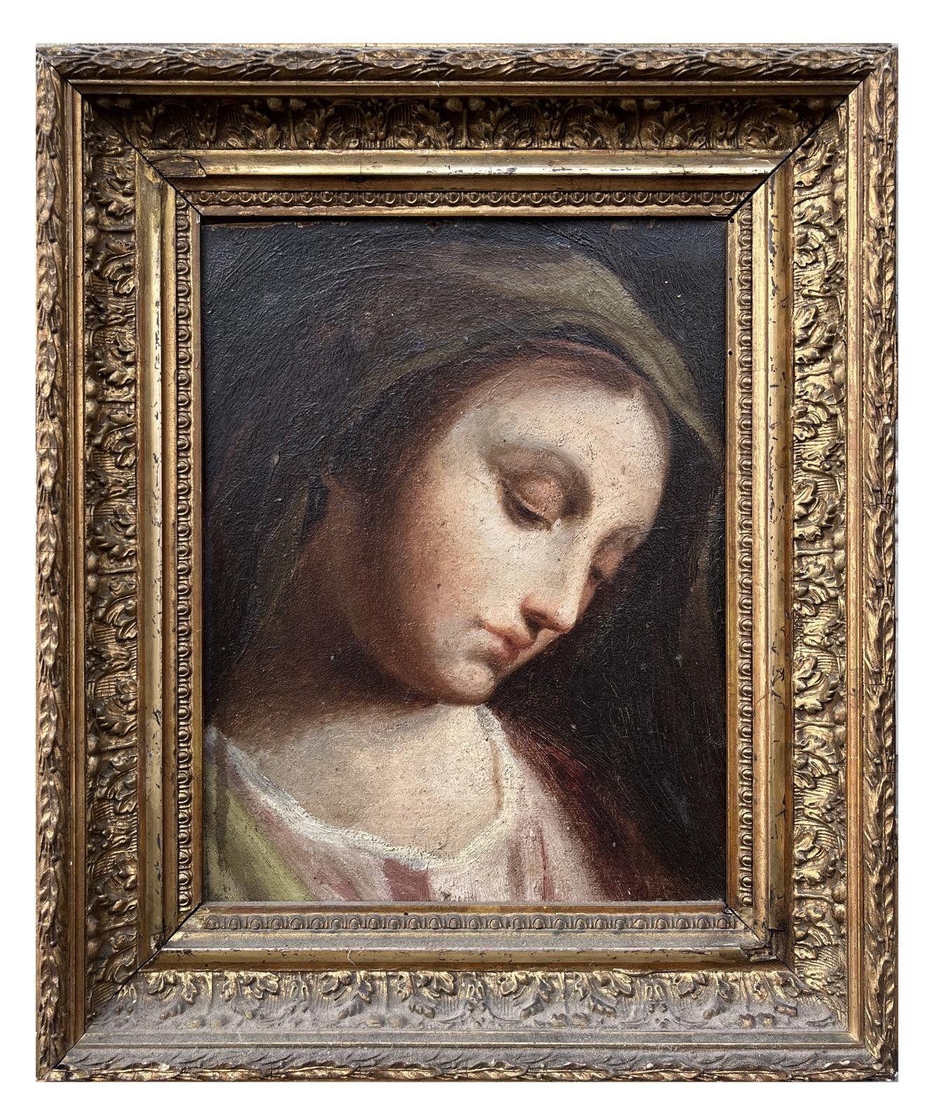 Anónimo europeo s. XVIII Óleo sobre cartón «Virgen María» 22 x 17 cm