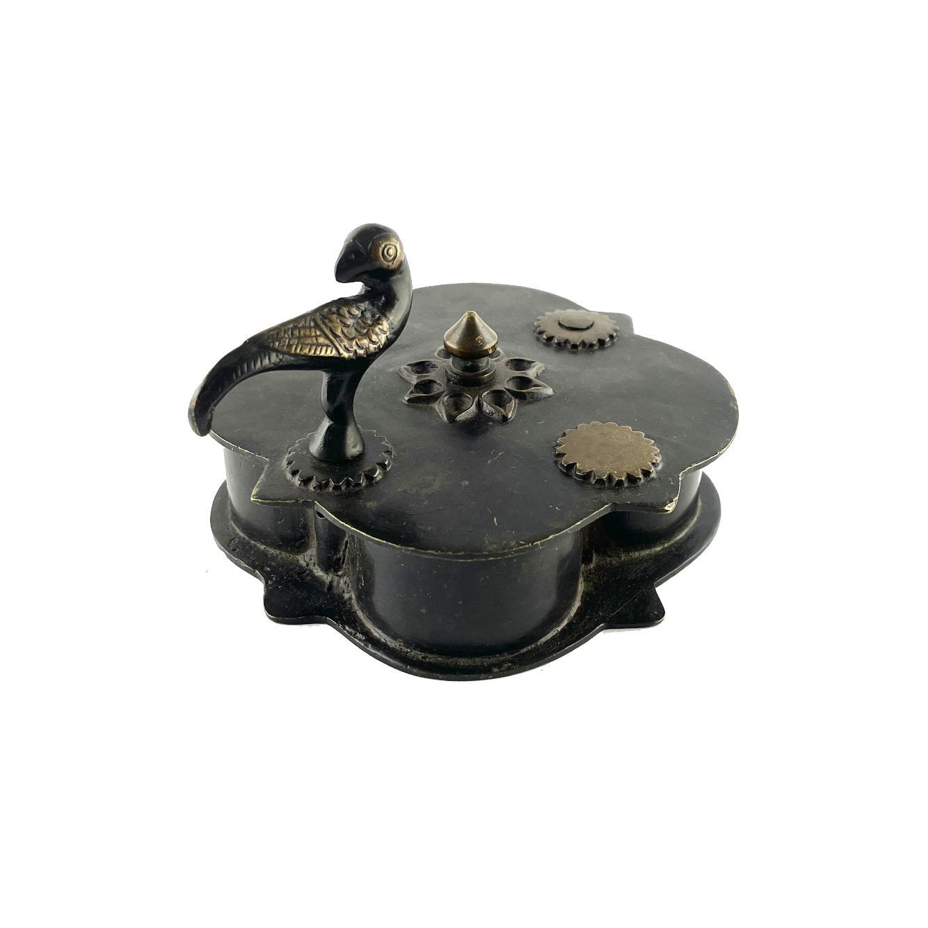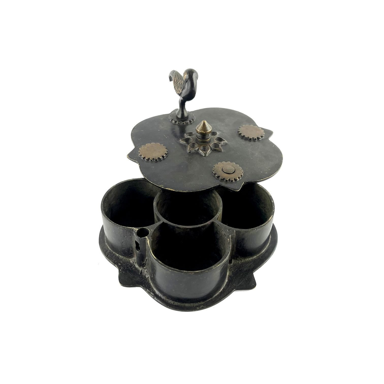 Antiguo especiero oriental de sobremesa en bronce pátina oscura decorado «flores» y esculturado «ave». 11 x 15 x 15 cm. Falta llave y cerradura.