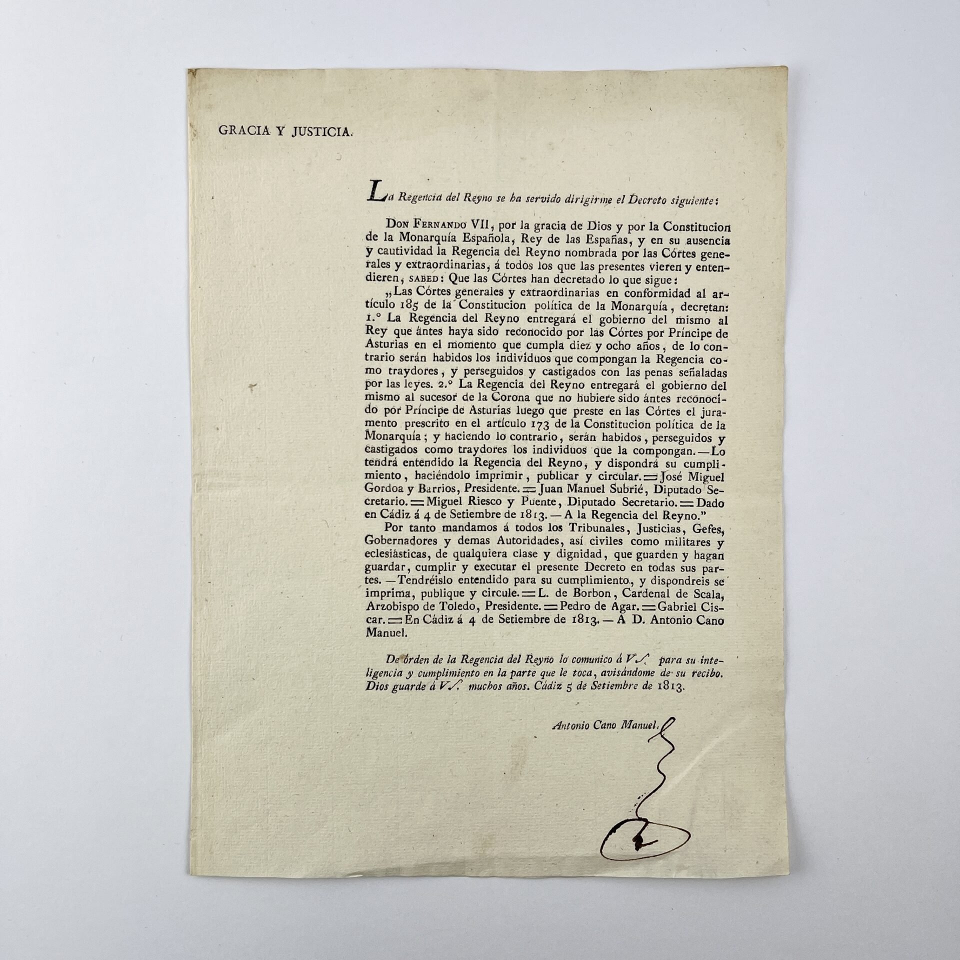Gracia y Justicia. La Regencia del Reyno se ha servido dirigirme el Decreto siguiente: (…) (Al final:) Cádiz, 4 de Septiembre de 1813.