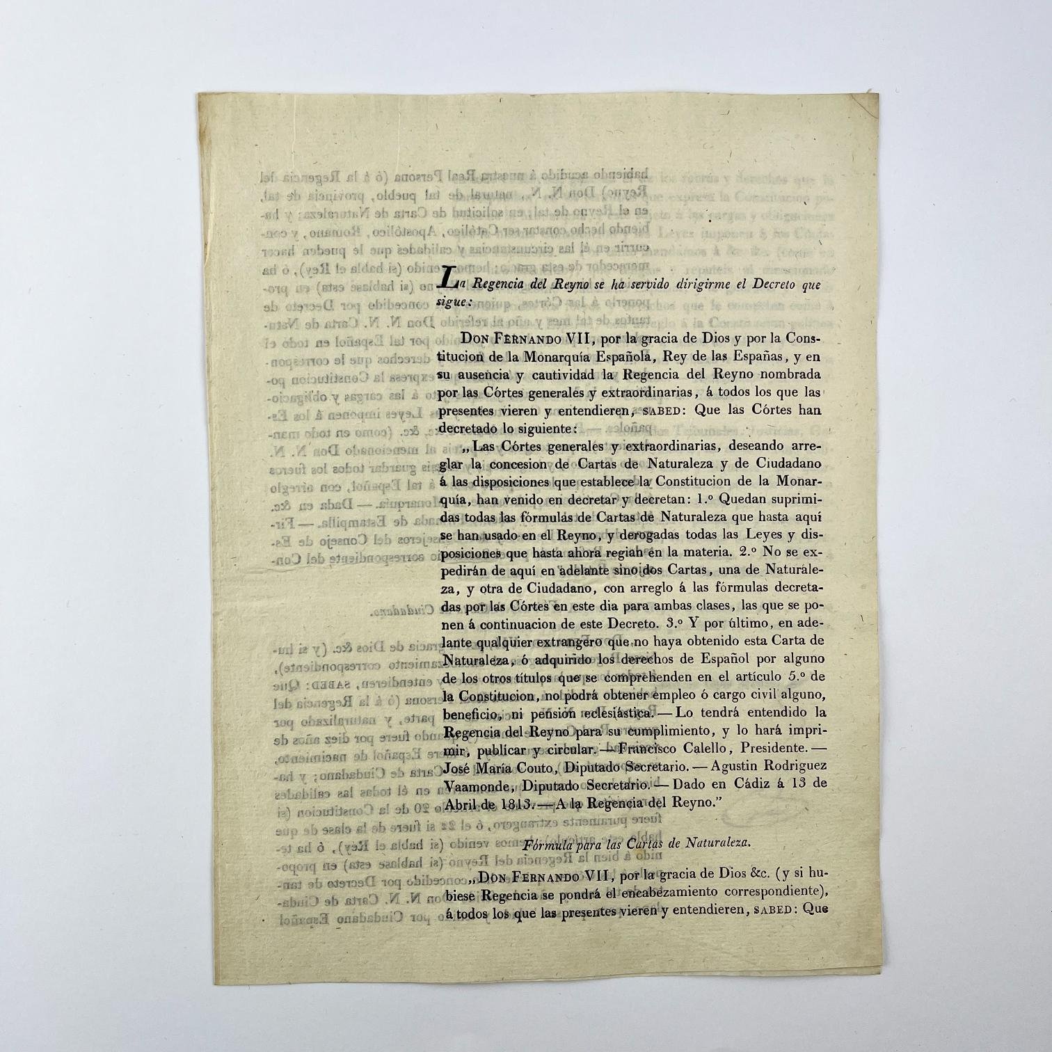 La Regencia del Reino se ha servido dirigirme el decreto que sigue: Don Fernando VII, por la gracia de Dios (…) y en su ausencia y cautividad la Regencia del Reyno nombrada por las Cortes generales y extraordinarias (…) (Al final:) Cádiz 13 de Abril de 1813.