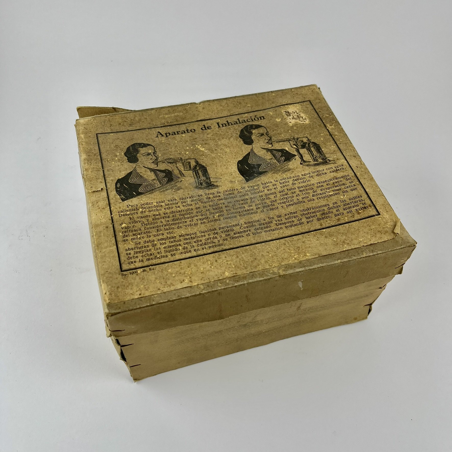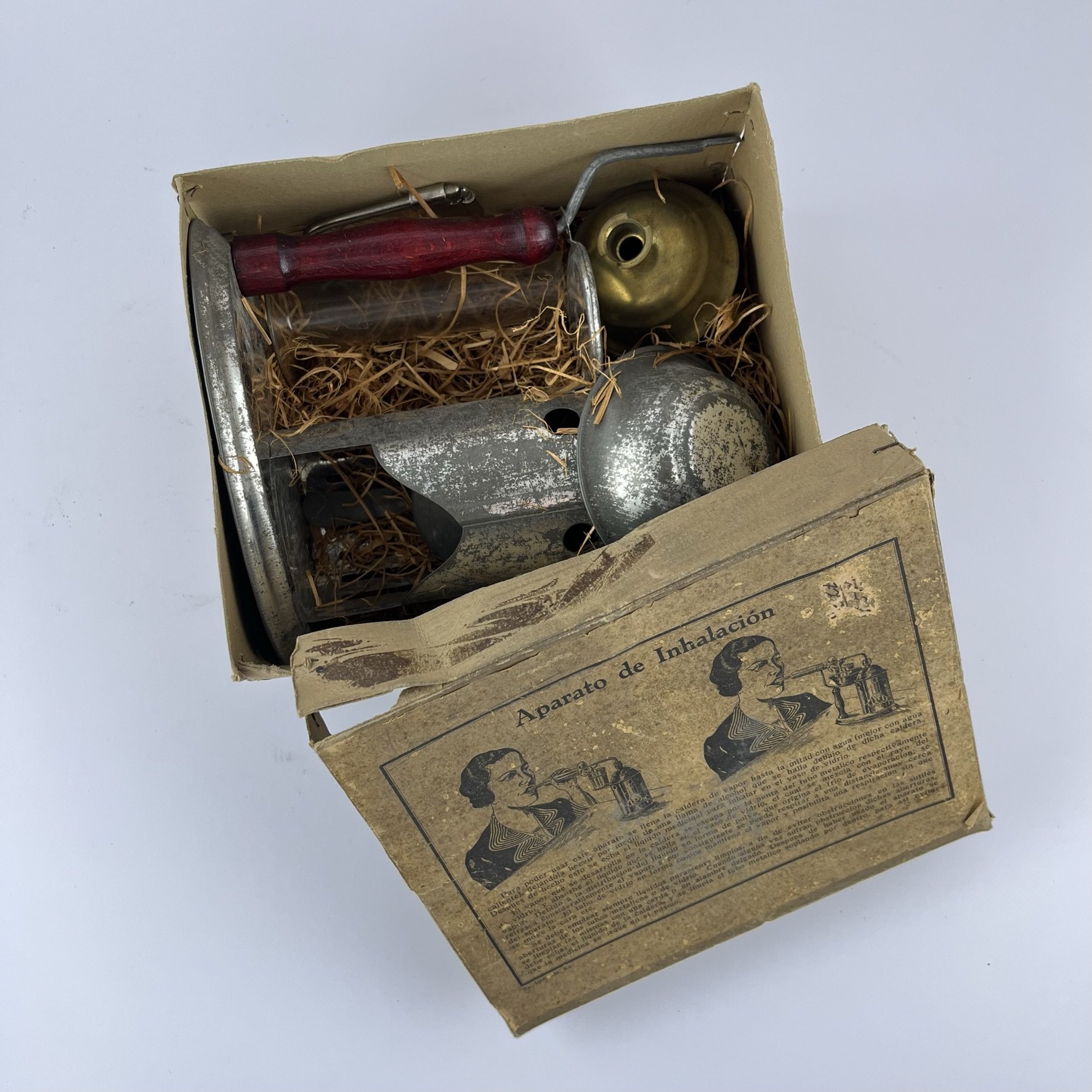 Aparato de inhalación a mechero, en hojalata, madera y vidrio. En caja original.