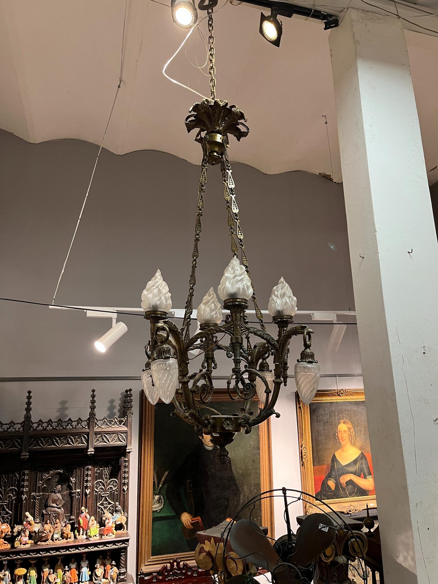 Araña estilo imperio en bronce cincelado «hojas y flores» y esculturada «cabezas de águila», con fanales en cristal esmerilado y tallado. 145 x 80 cm.